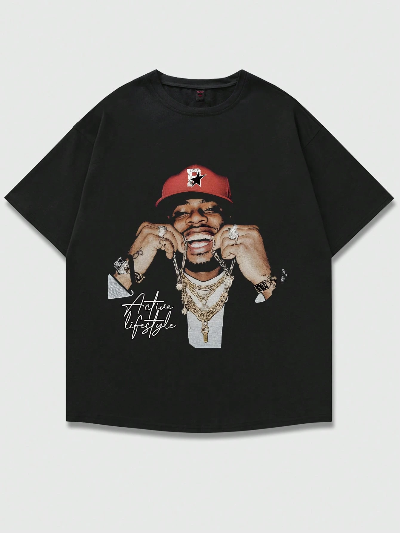Street Life Camiseta gráfica con talla grande para mujer con estilo callejero estadounidense, retrato personalizado de hip-hop y estampado de texto en inglés