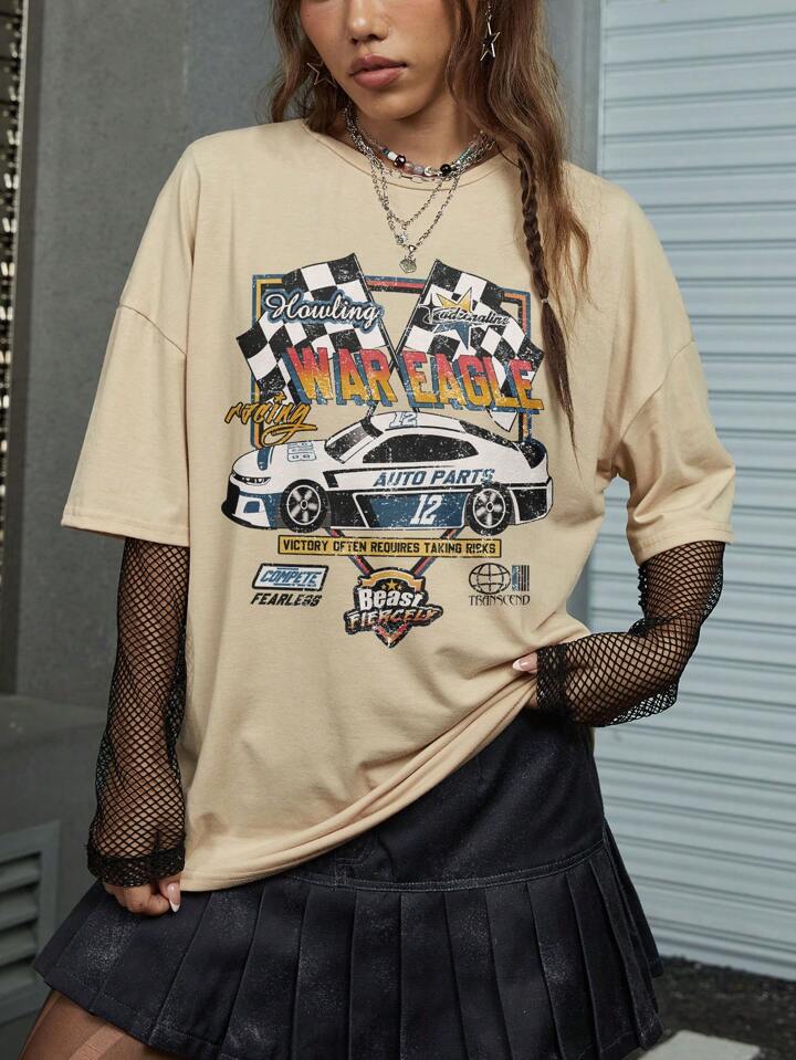 Street Life Camiseta Con Hombros Caídos Y Estampado De Letras Y Coche Para Mujer