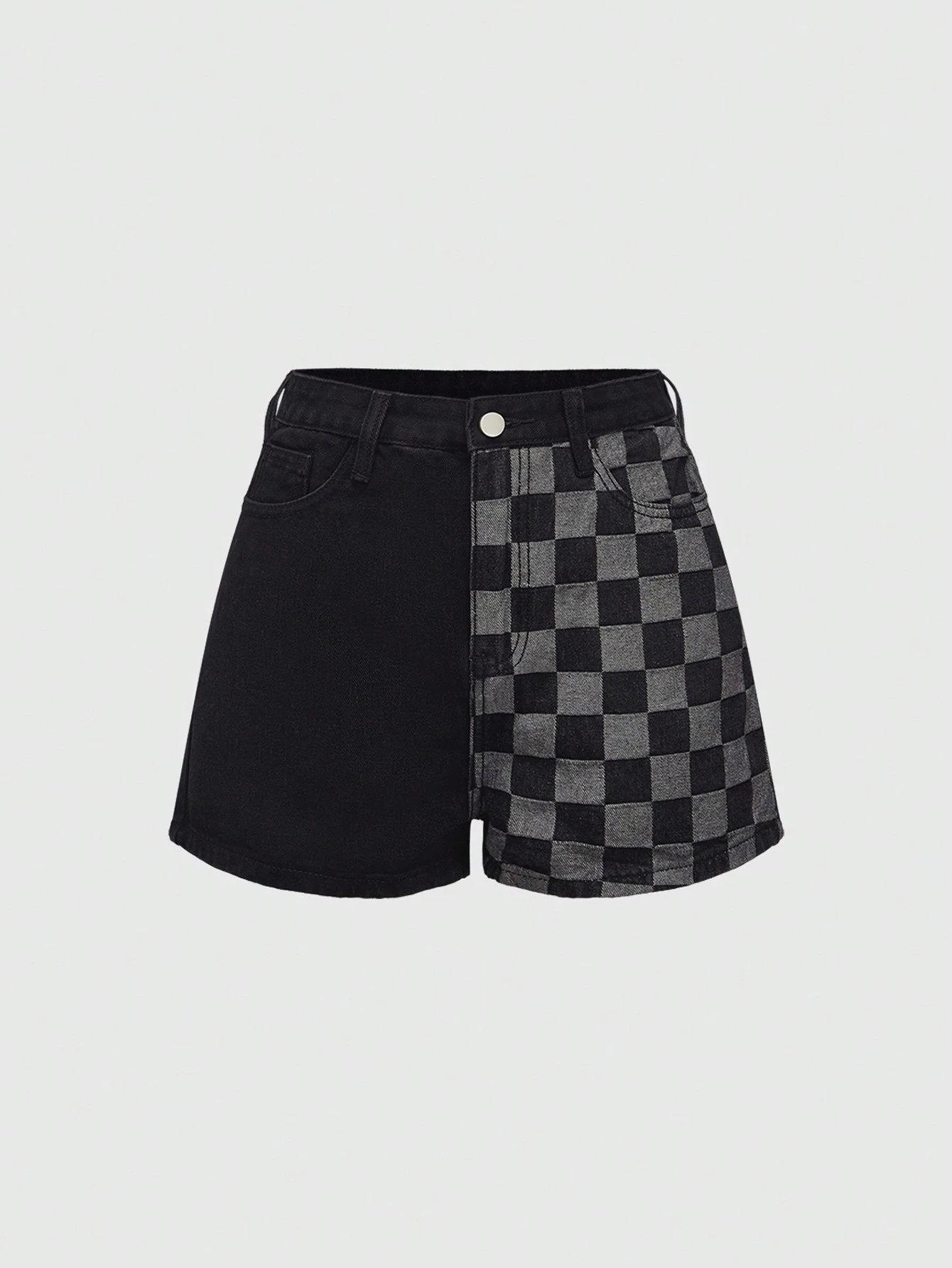 Street Life Shorts de mezclilla con parches a cuadros y bolsillos para mujer, casuales y versátiles