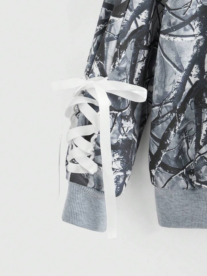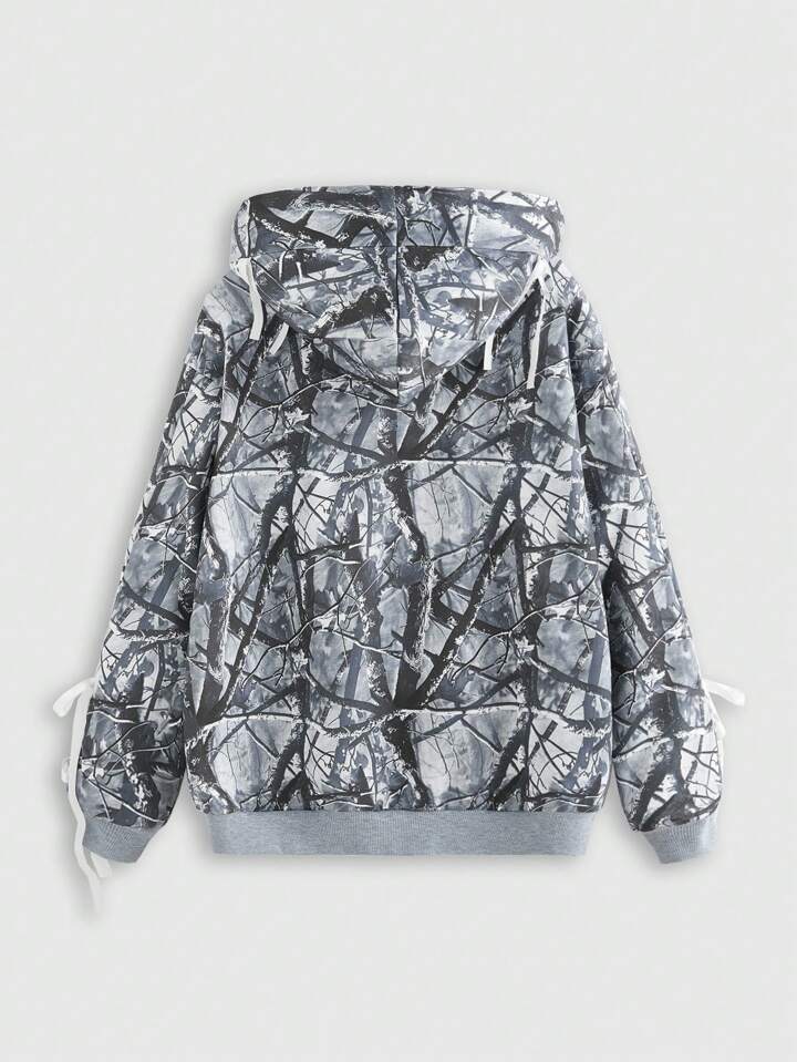 Street Life Sudadera con capucha de mujer con estampado de camuflaje, lazo y letras, manga larga, estilo callejero Y2K