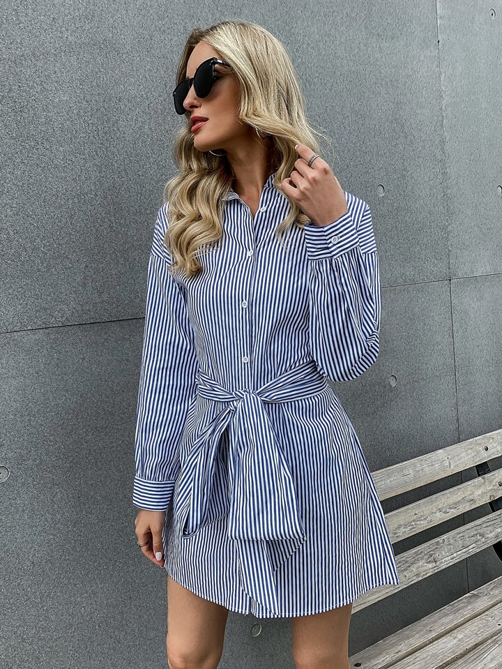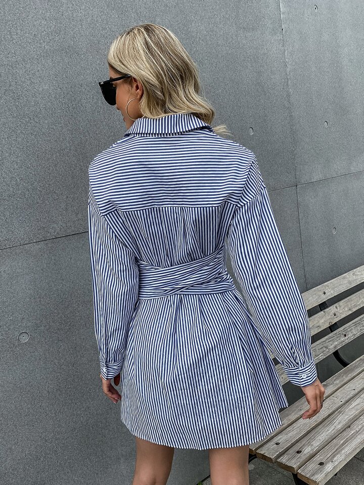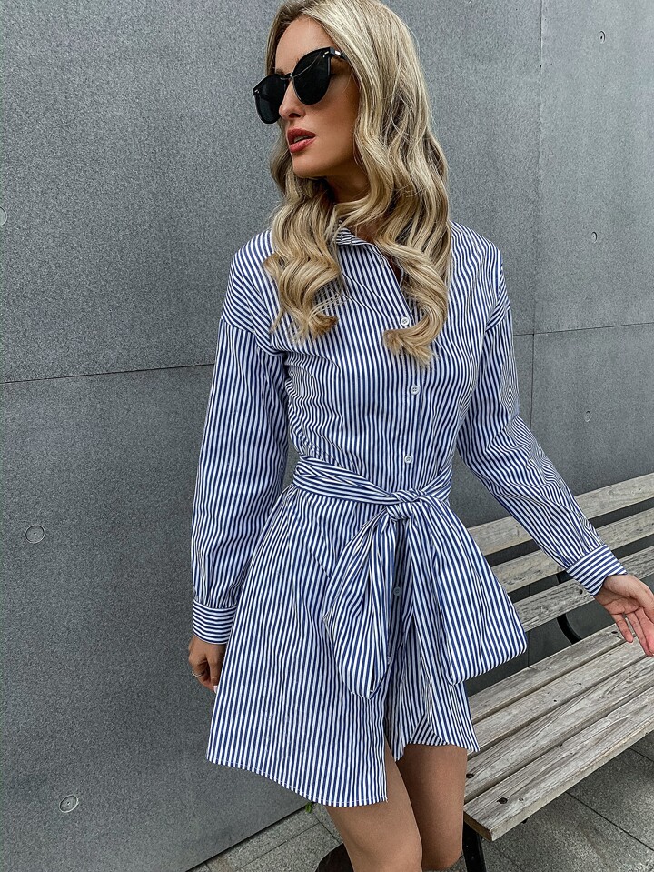Vestido estilo camisa con cinturón con botón delantero de rayas