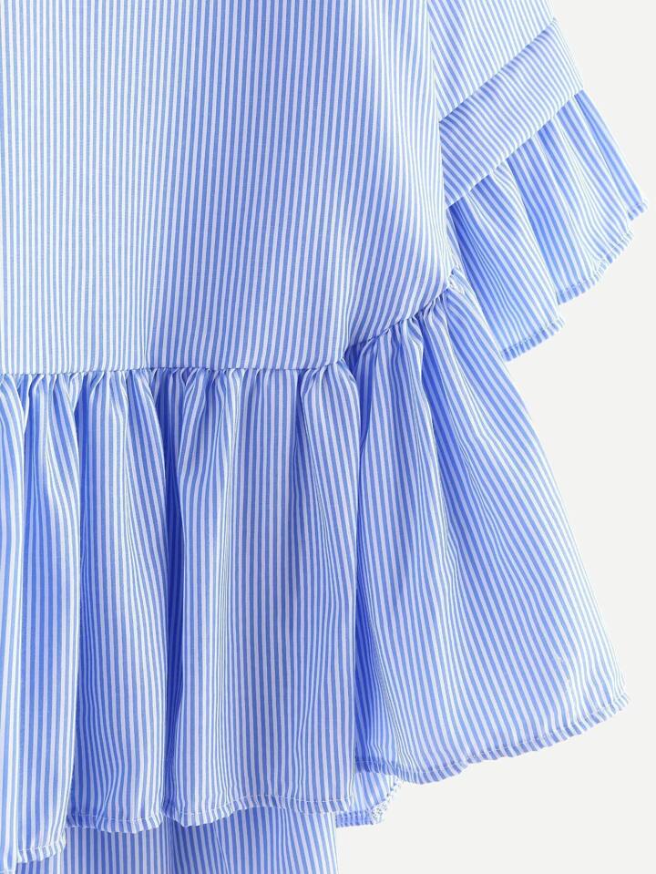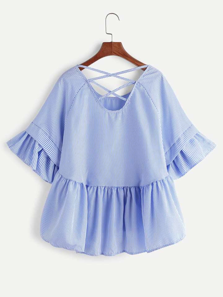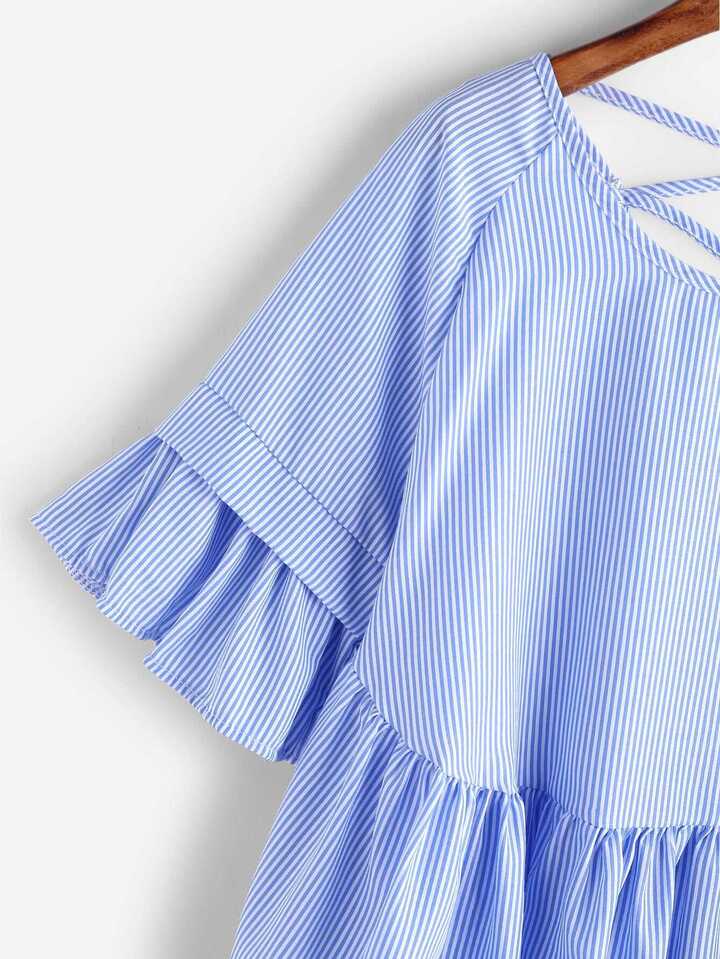 Blusa asimétrica de rayas con tiras cruzadas con volantes