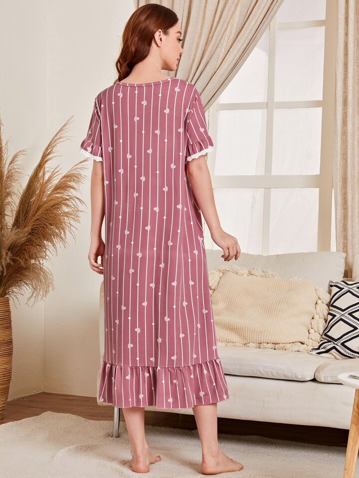 Vestido de dormir largo con dobladillo con volantes, estampado de rayas y corazones