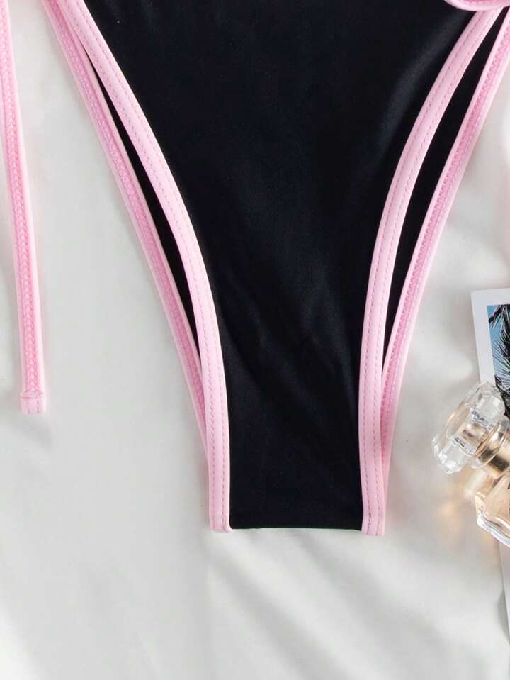 Conjunto de bikini de tanga triangular con ribete de contraste para playa de verano