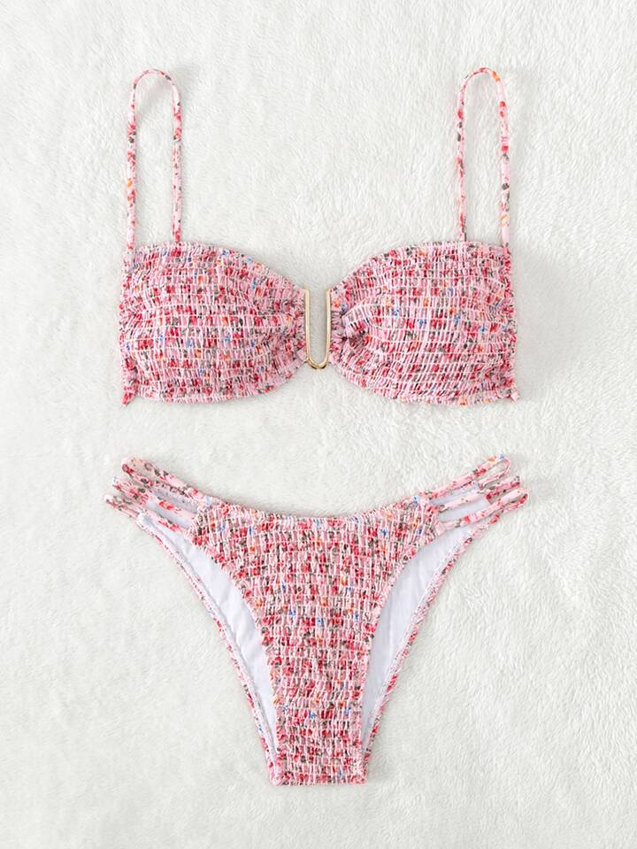 Conjunto de bikini con estampado floral pequeño fruncido para la playa de verano
