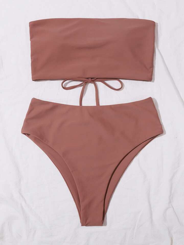 Conjunto de bikini unicolor Sujetador de tubo reversible con cordones en la espalda y parte inferior de talle alto Traje de baño de 2 piezas