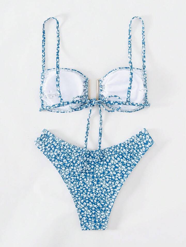 Conjunto de bikini de 2 piezas con parte superior tipo camiseta con argollas y Bottom tipo culote con estampado floral de estilo sencillo de verano