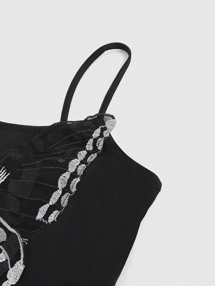 Camiseta de tirantes de encaje con decoración de mariposa, estilo veraniego