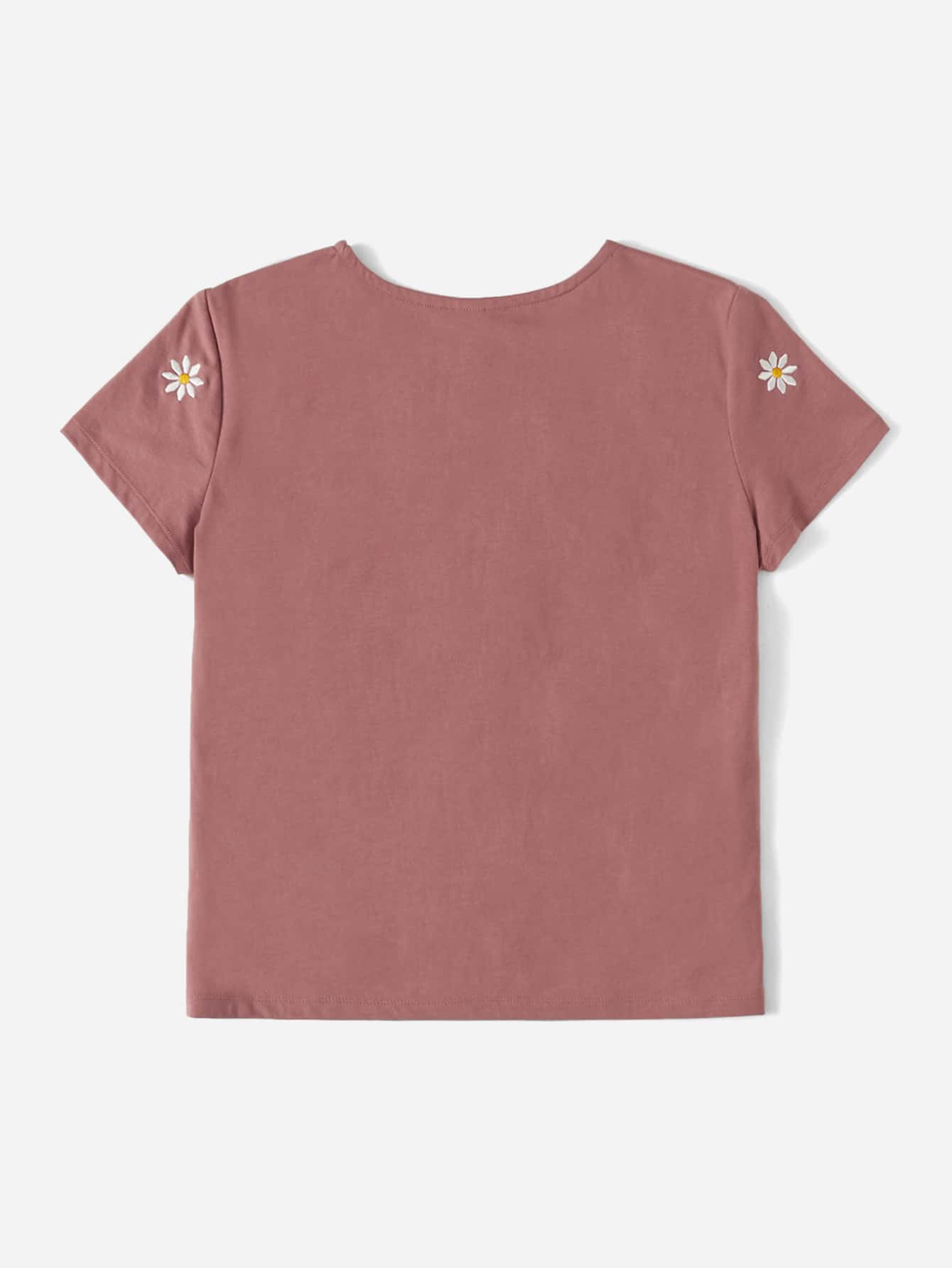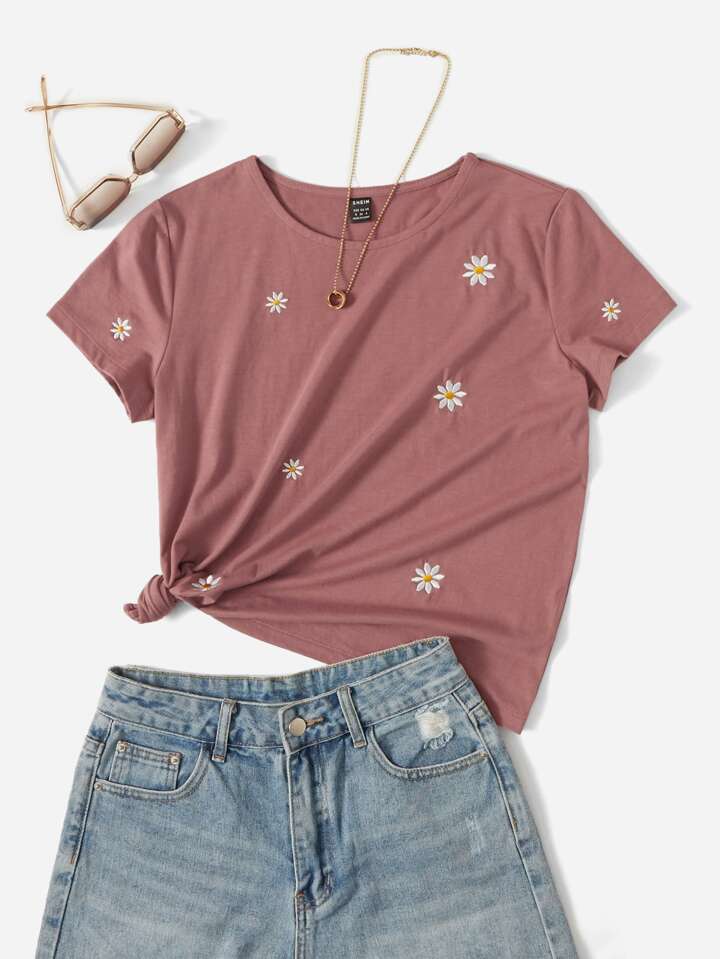 Camiseta Rosa Casual Y Holgada De Manga Corta Con Bordado Floral De Margarita Para Verano