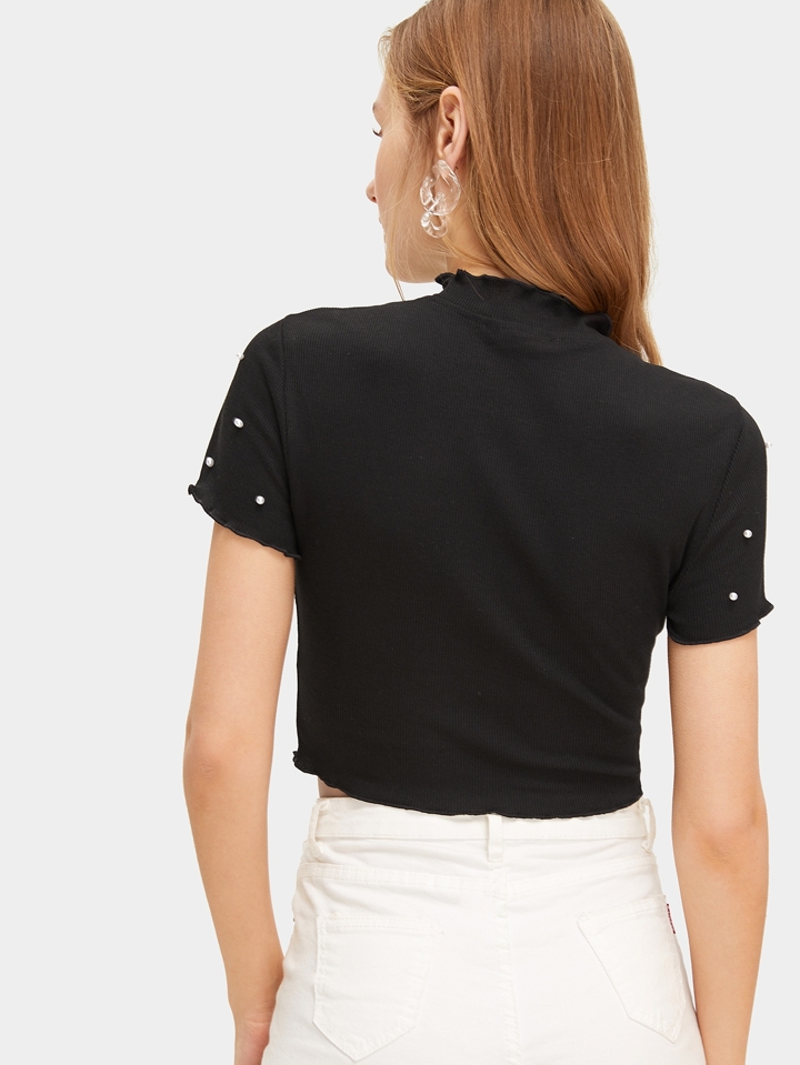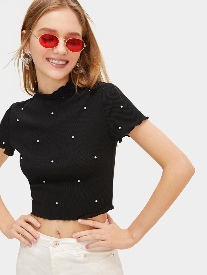 Top corto con recorte de lechuga y abalorios de perla, conjunto de ropa de verano