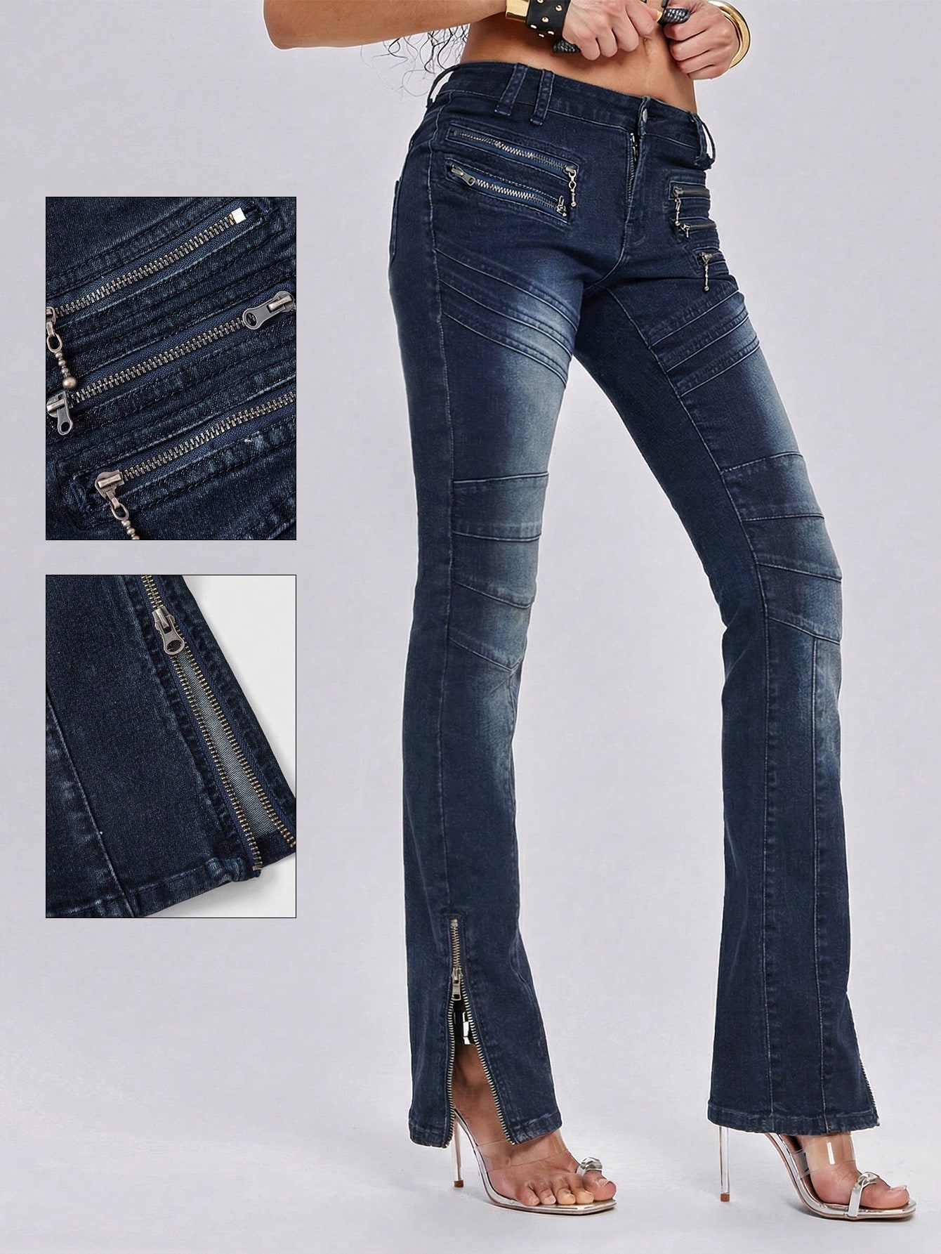 Atuendo de festival de música Y2K con jeans pitillo de talle ultra bajo (diseño de dobladillo con cremallera para uso de doble vía)