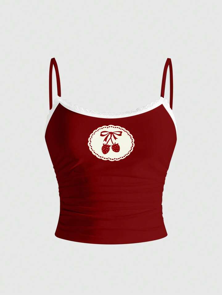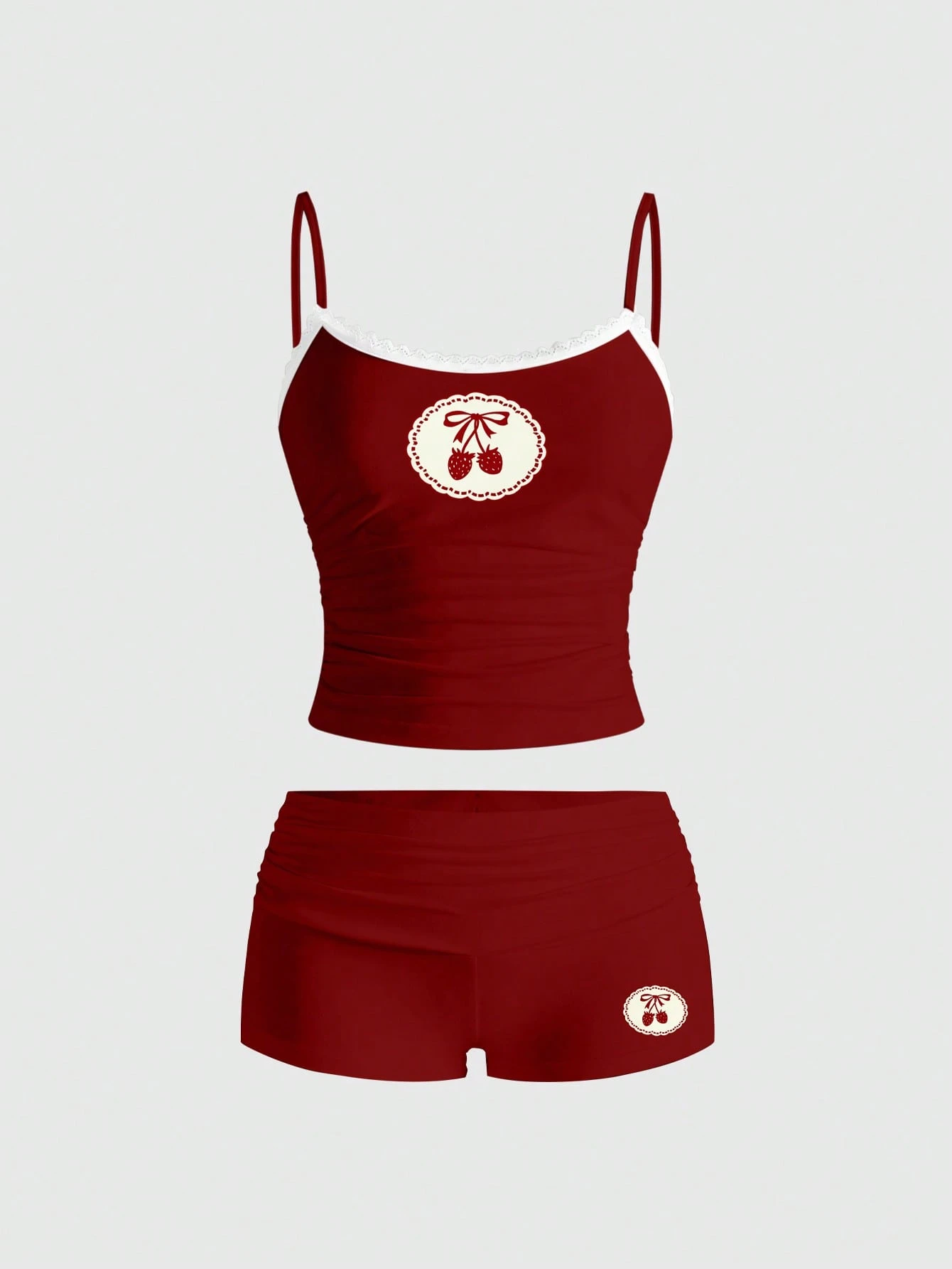 Sweetness Conjunto de 2 piezas de camiseta y pantalones cortos sexy con estampado de corazón, melocotón y cereza para mujeres
