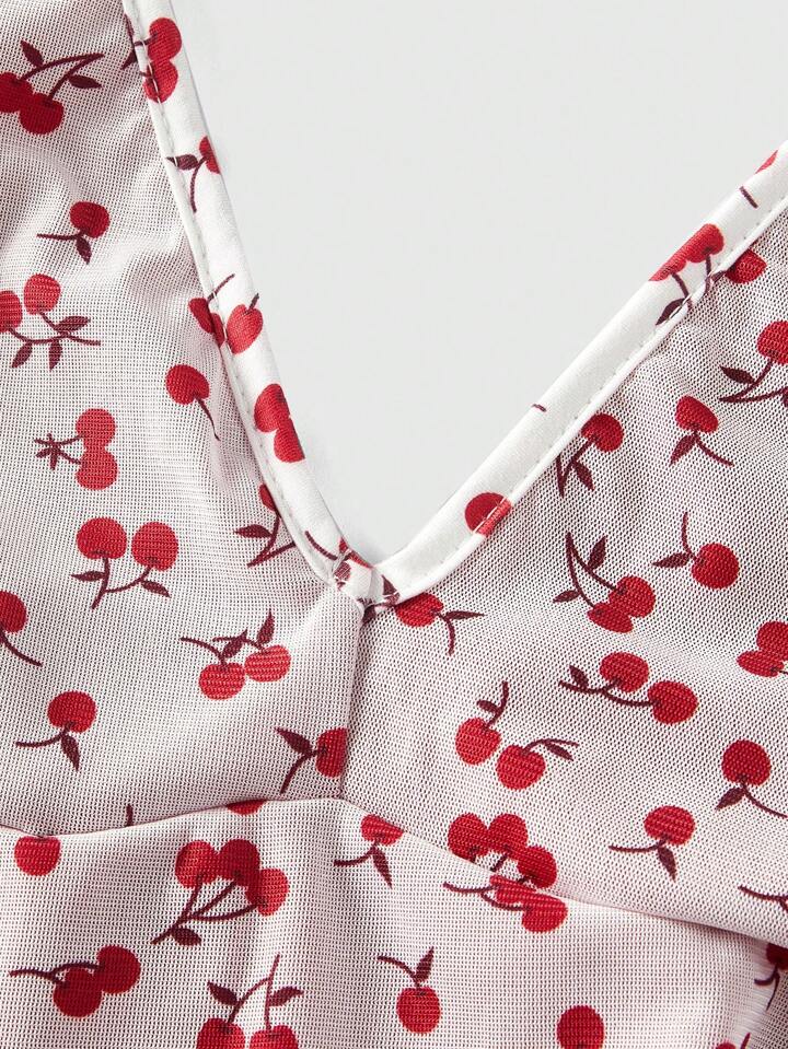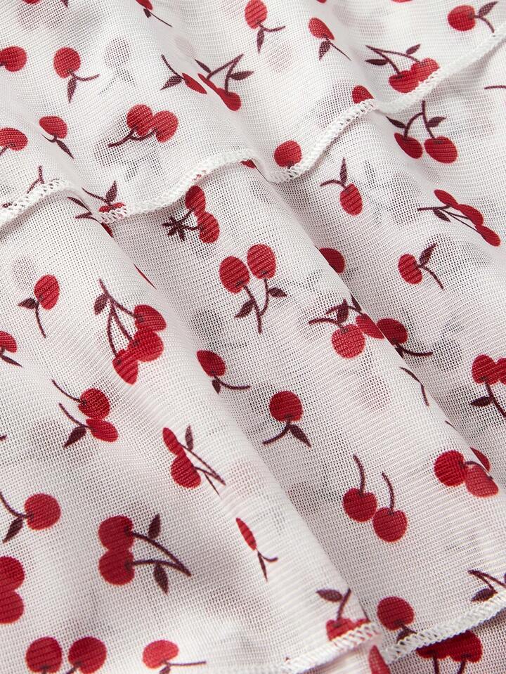 Sweetness Vestido de verano corto y sin espalda con estampado de cerezas, sexi y lindo con volantes y halter
