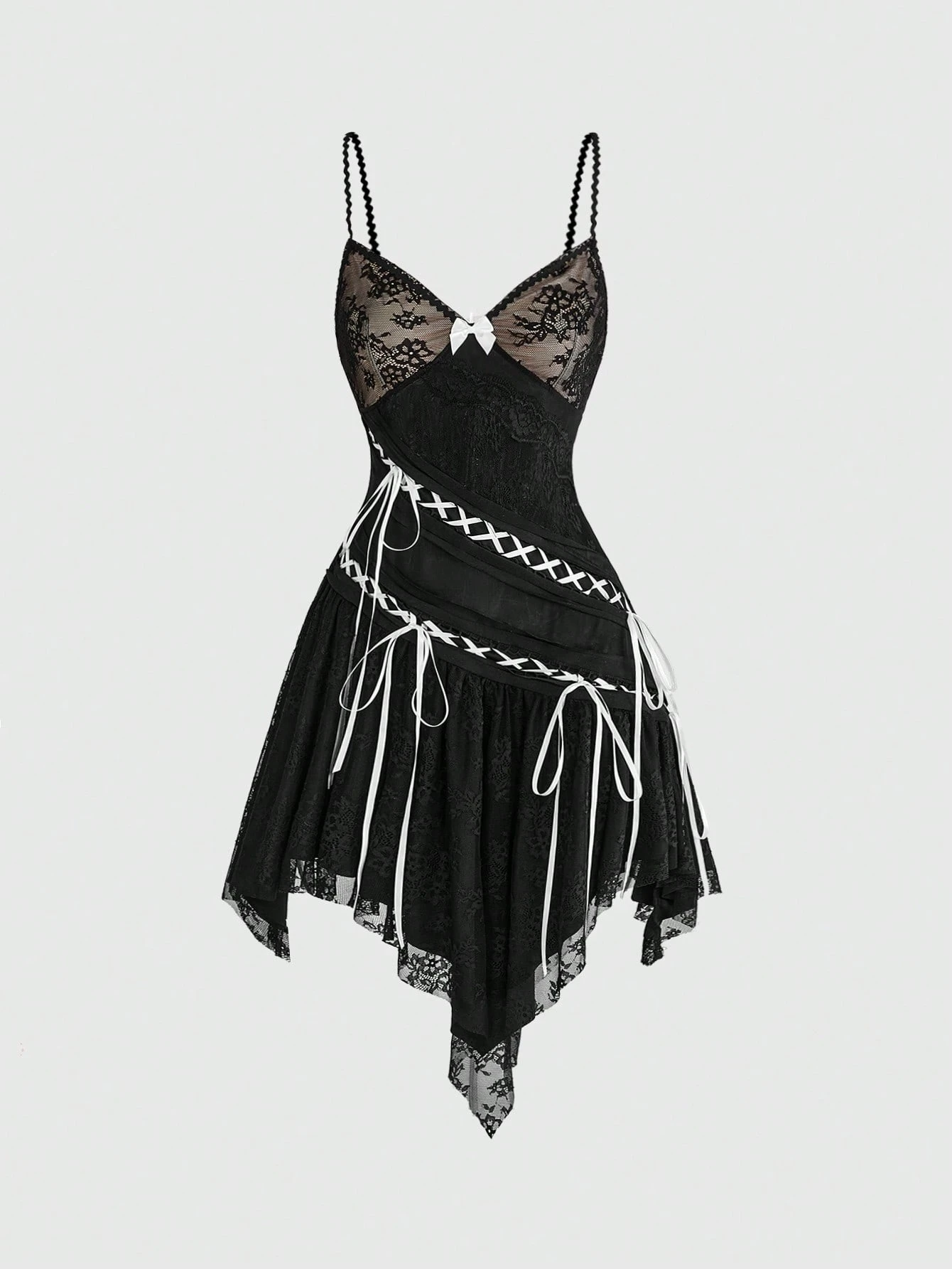 Sweetness Vestido corto asimétrico de mujer con tirantes finos, contraste de encaje de malla y lazo con cordón en el bajo