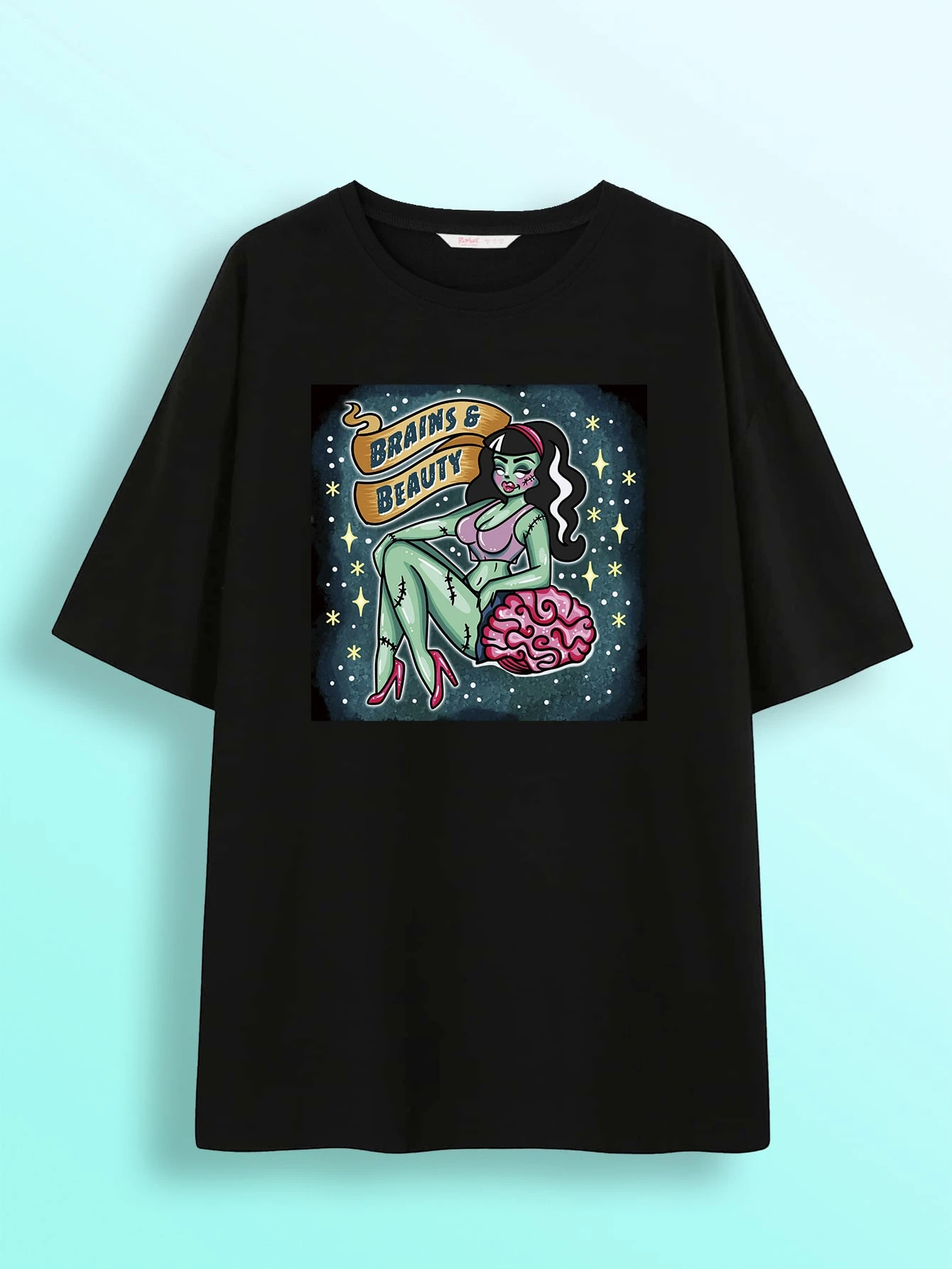 TarrynAnnIllustration Camiseta de hombros caídos con letra con estampado de figura
