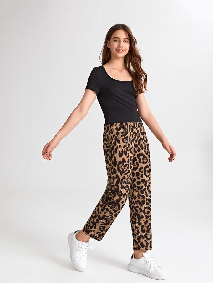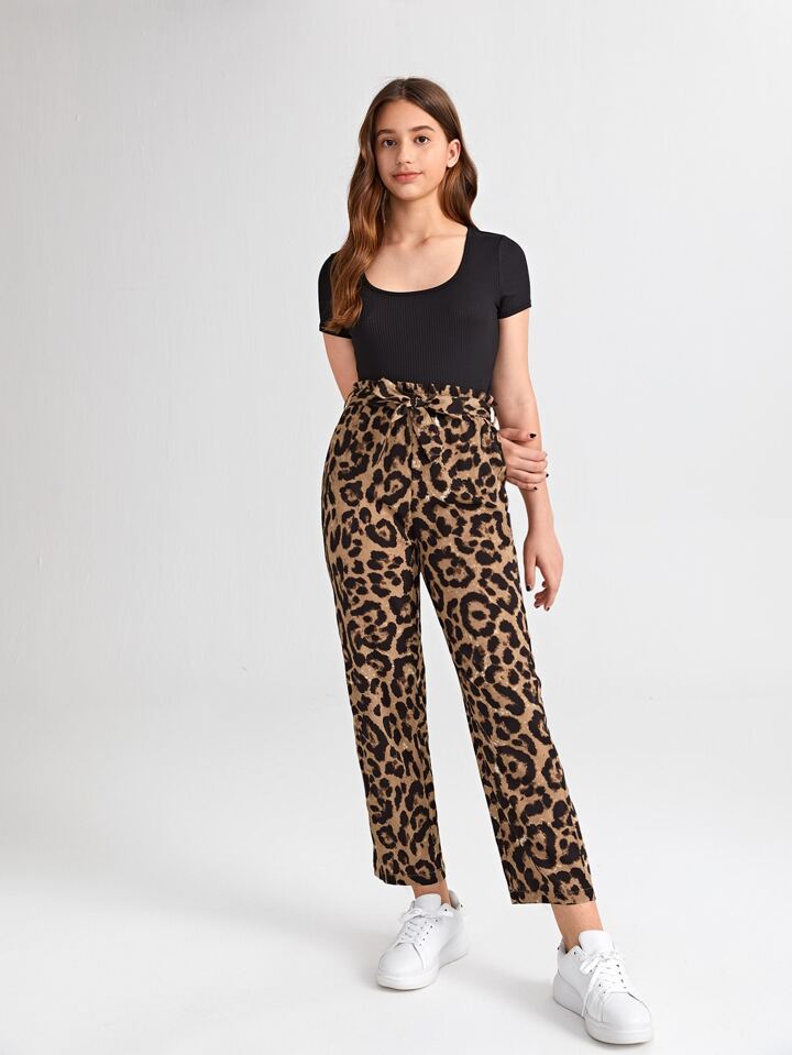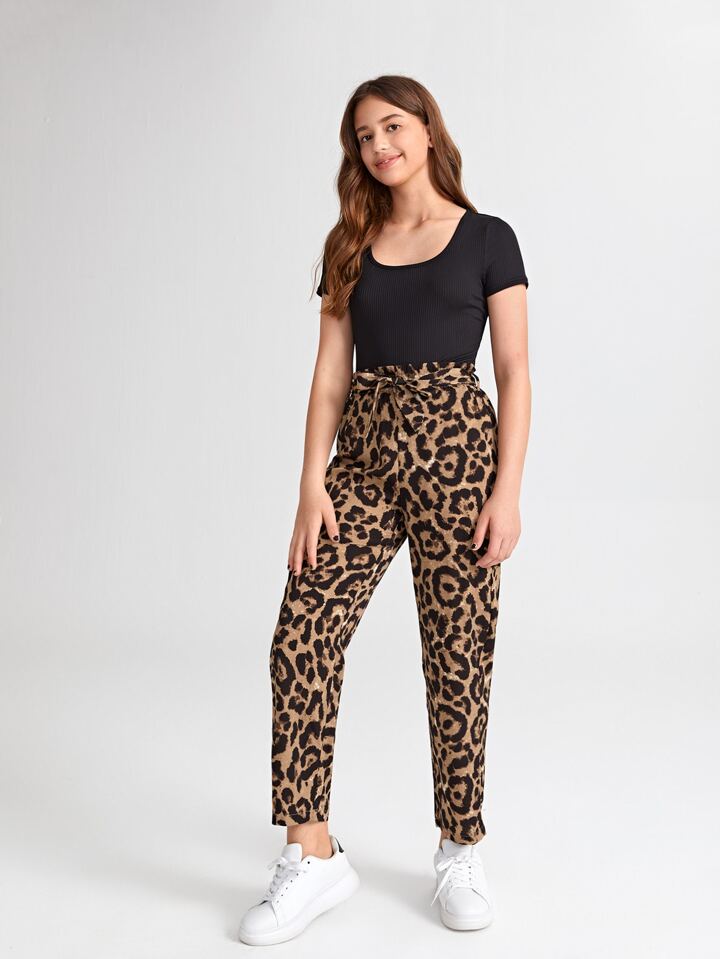 Conjunto De Blusa Sólida Para Chicas Adolescentes Y Pantalones Con Estampado De Leopardo Con Cinturón