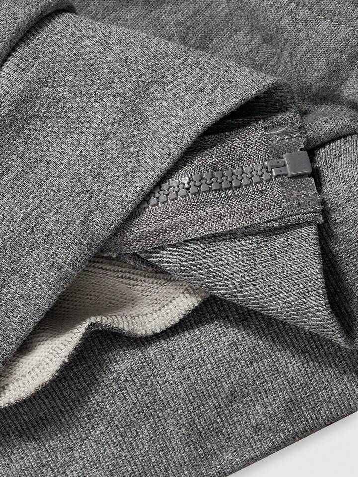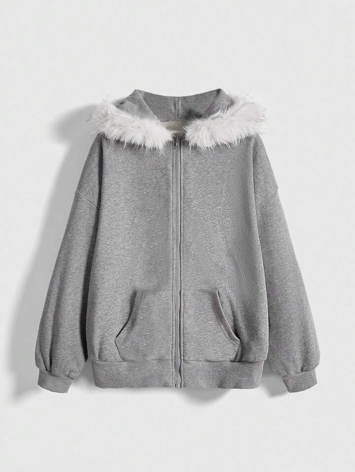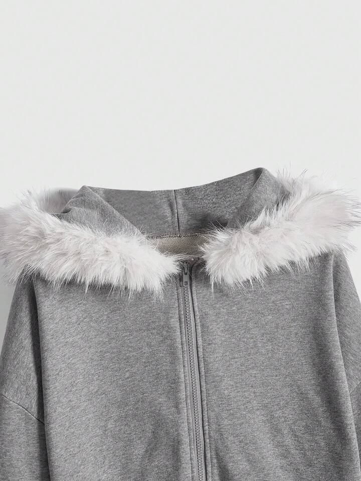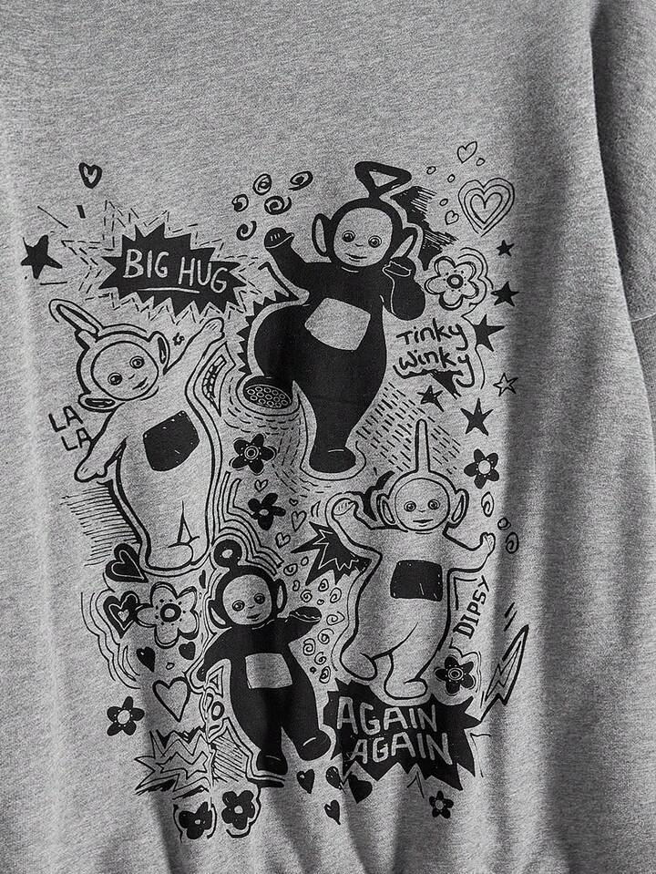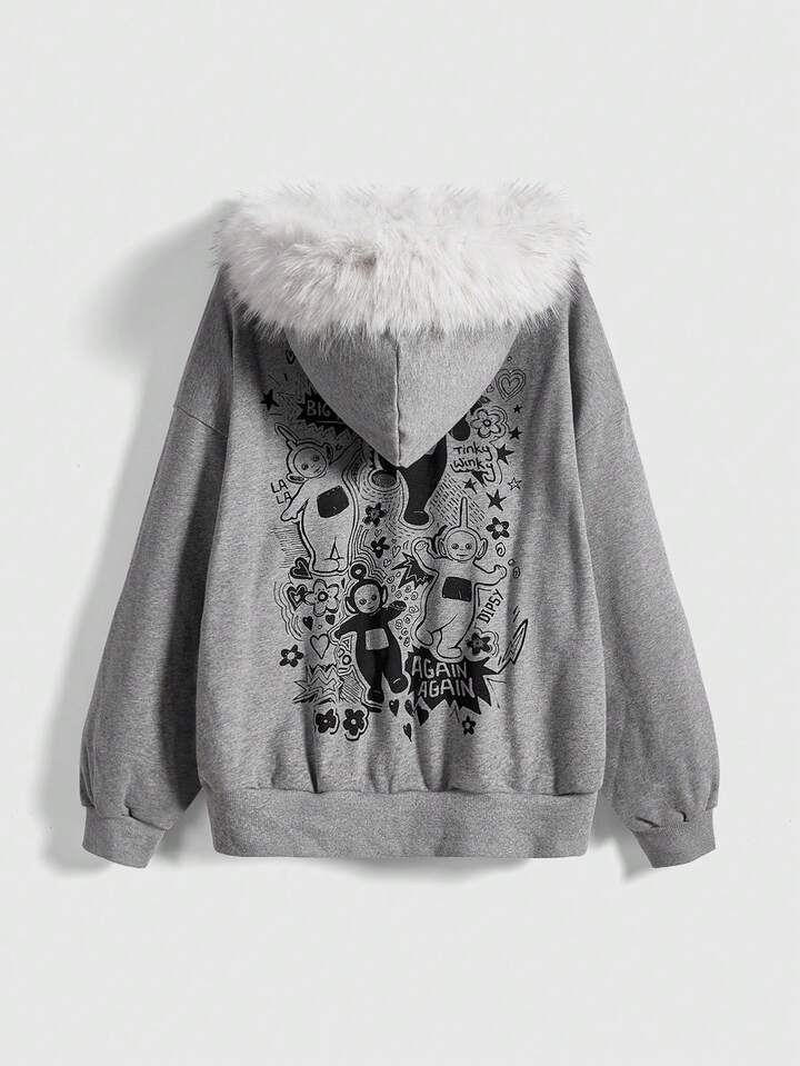 Teletubbies X ROMWE Sudadera con capucha con cremallera, suelta, con estampado de dibujos animados lindos y ribete de peluche en contraste