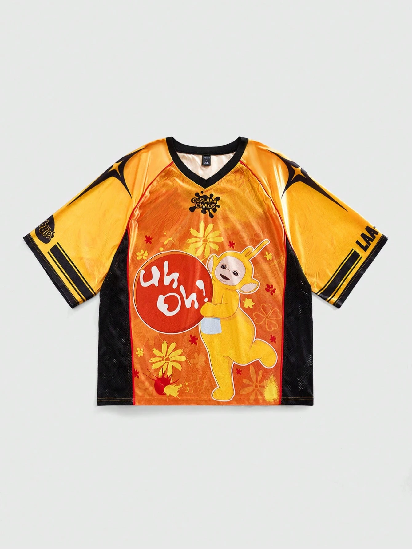 Teletubbies X ROMWE Camiseta de manga corta con cuello en V y estampado de dibujos animados de bloques de color para hombre, de verano