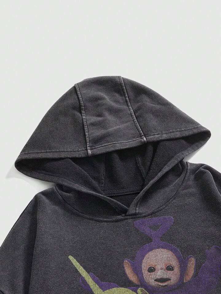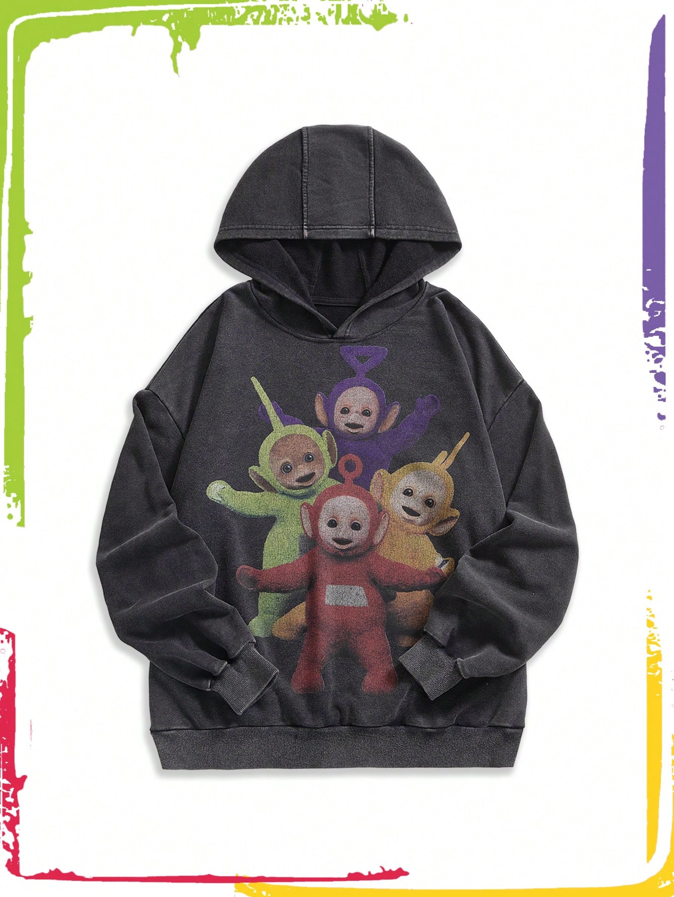 Teletubbies X ROMWE Sudadera con capucha casual de mujer con patrón de dibujos animados desgastado y vintage, otoño