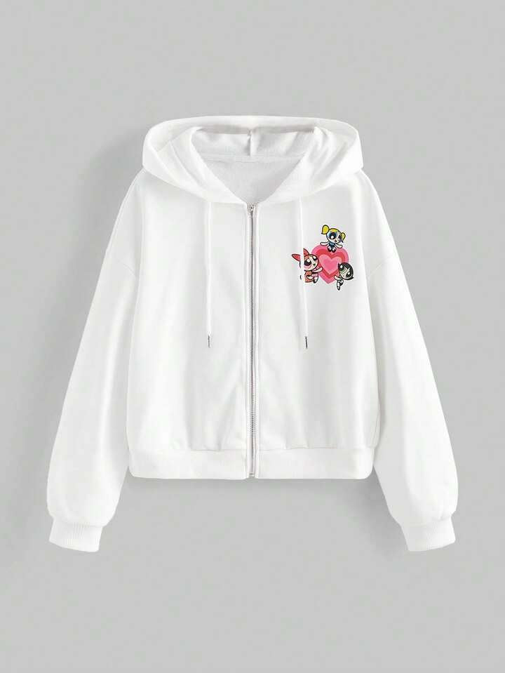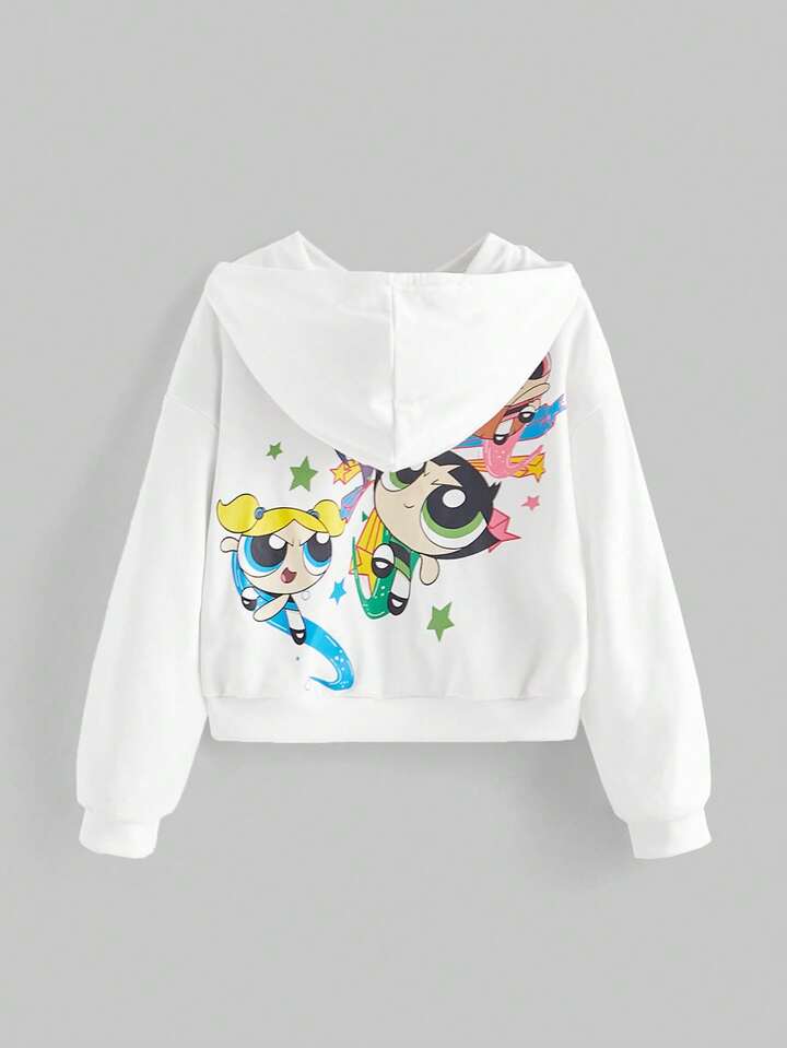 The Powerpuff Girls | ROMWE Sudadera con capucha con cordón y cremallera, estampado de dibujos animados, casual, para otoño