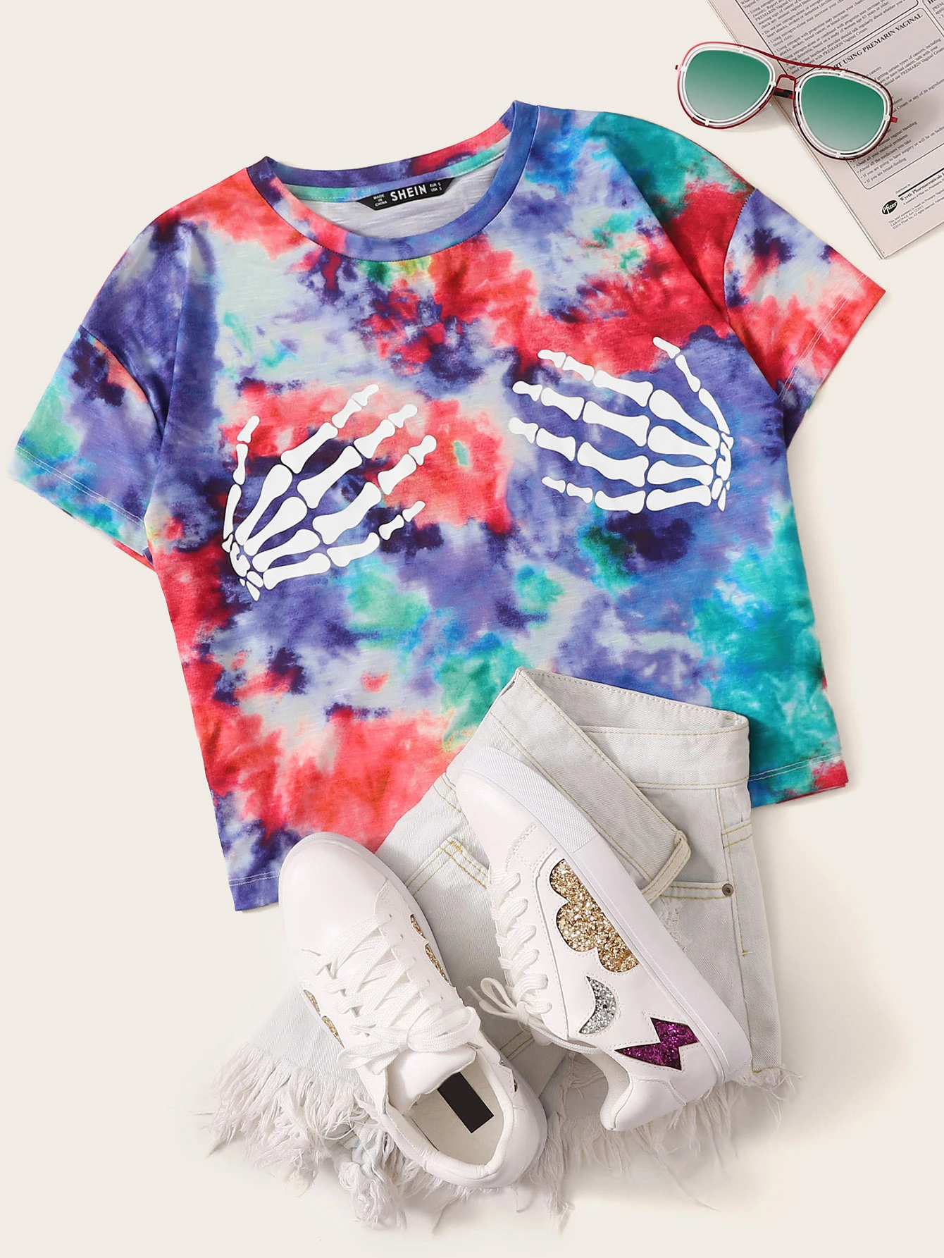 Camiseta con estampado de tie dye con mano de esqueleto de hombros caídos