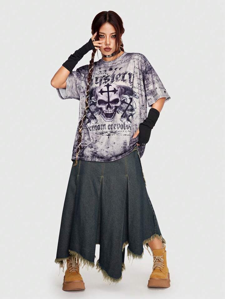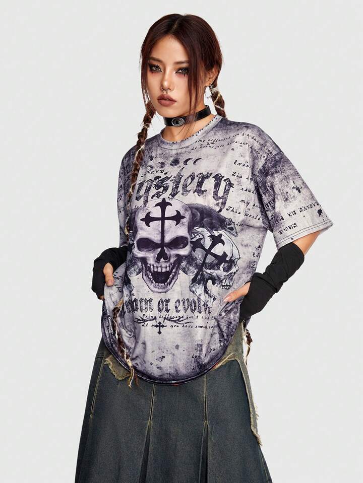 Goth Camiseta de hombros caídos de tie dye estampado de cráneo