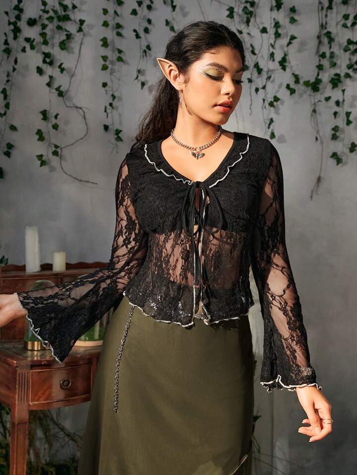 Top con cordón delantero manga de campana de malla