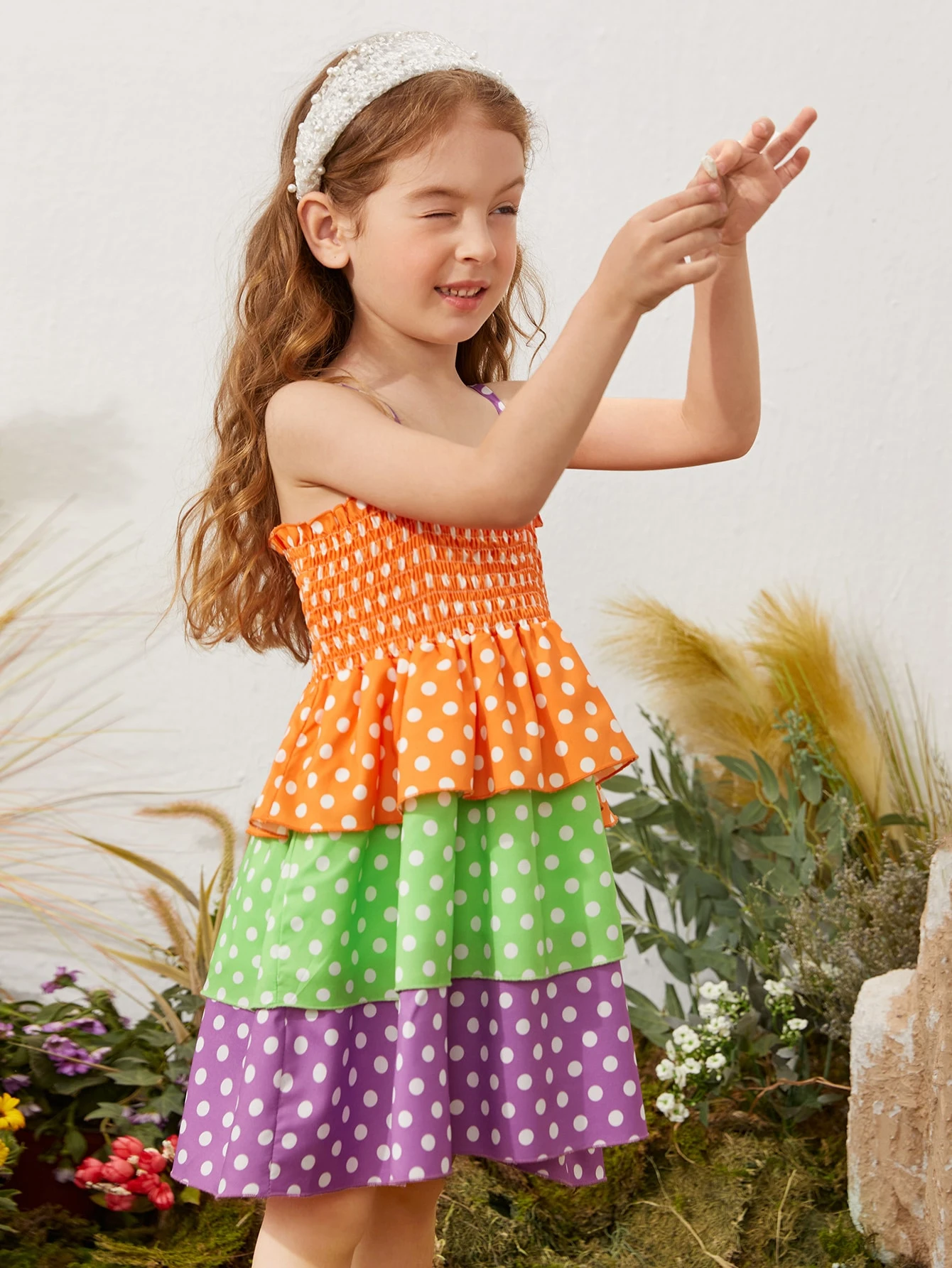 Vestido De Tirantes Acampanado En Capas Para Niñas Pequeñas, Con Lunares, Bloques De Color Y Fruncidos