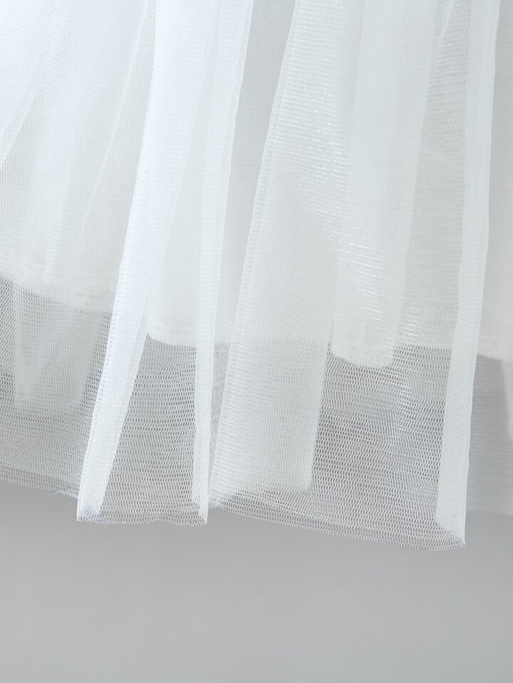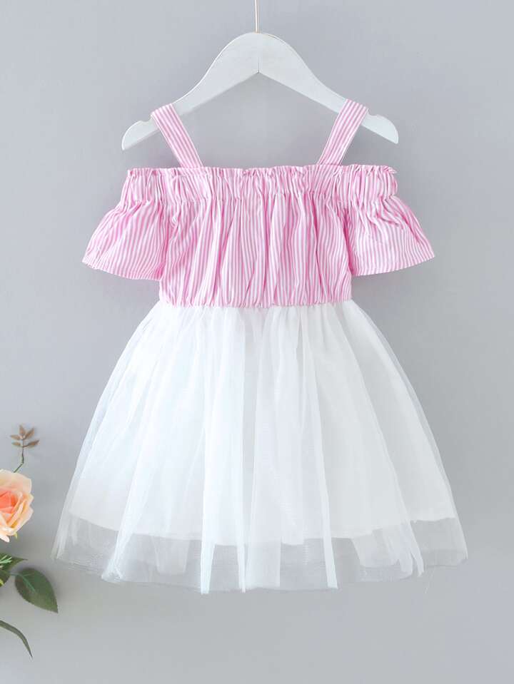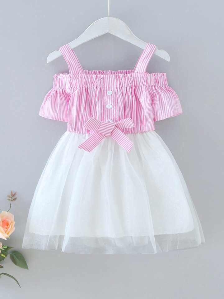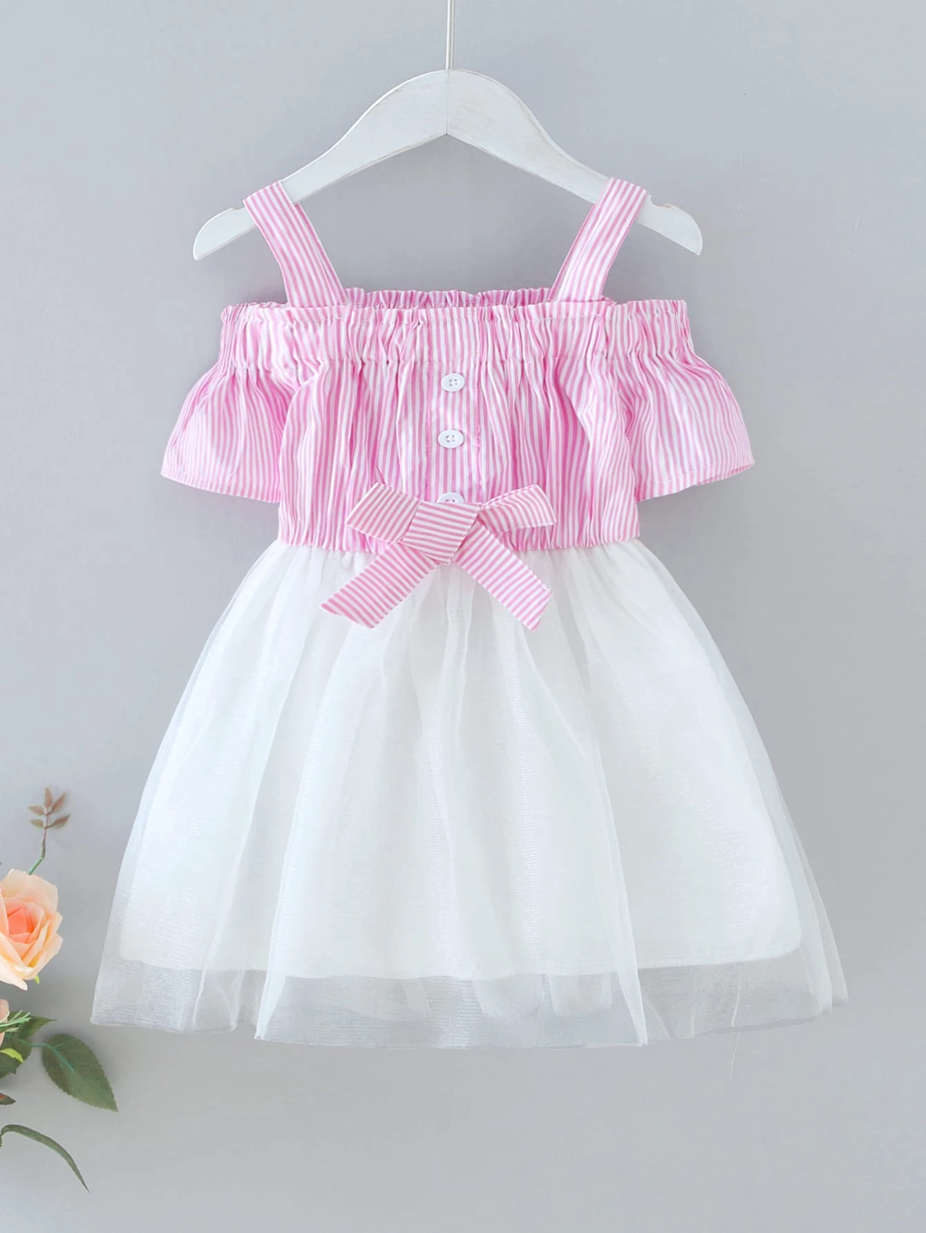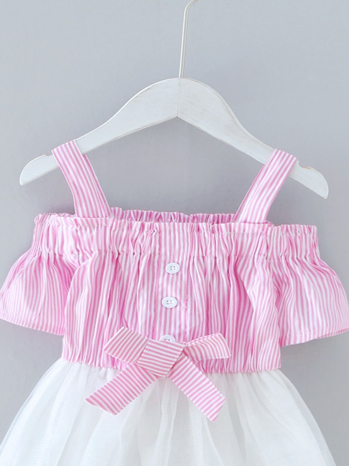Vestido de Niñas bajo con malla con lazo delantero de hombros descubiertos de rayas