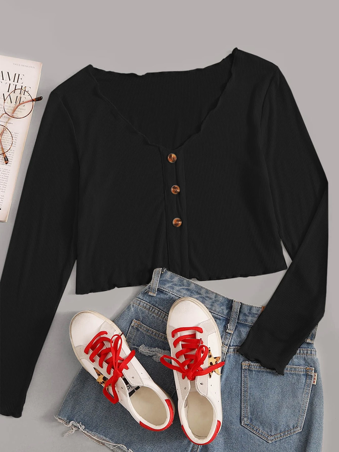 Camiseta de canalé corto escote v con botón delantero
