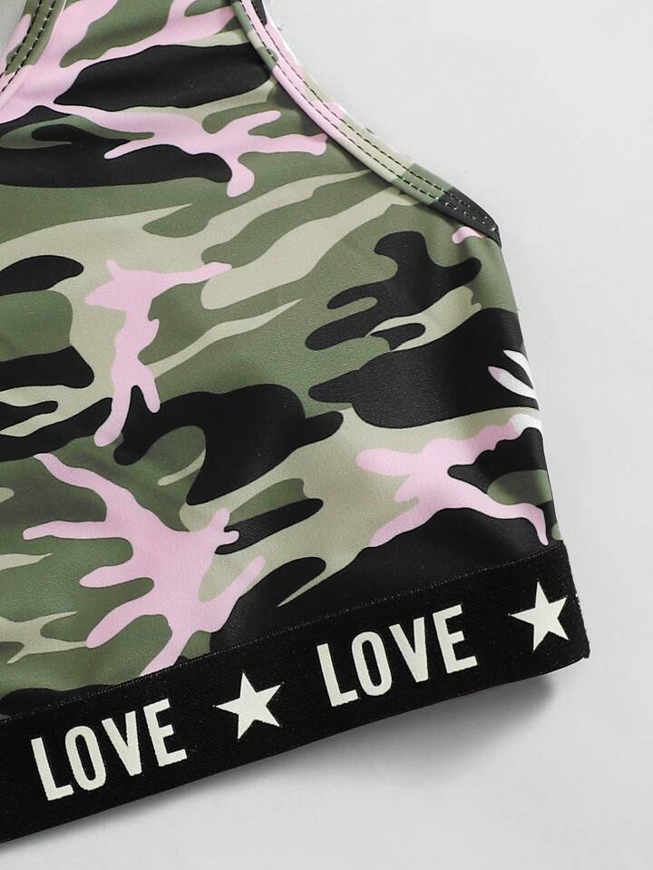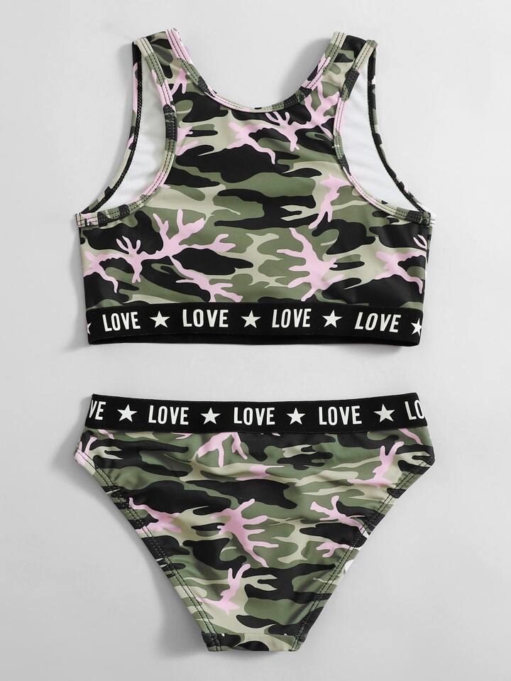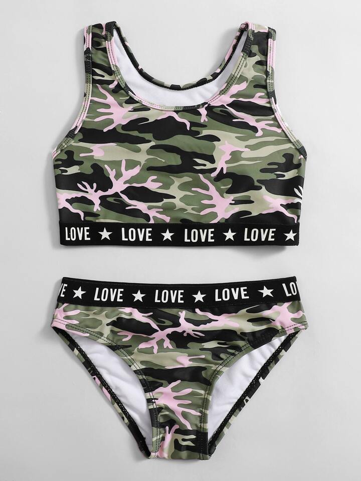 Conjunto de bikini con estampado de camuflaje y gráfico de letras para niña preadolescente, playa de verano