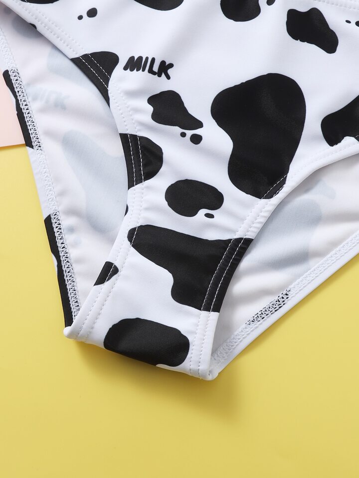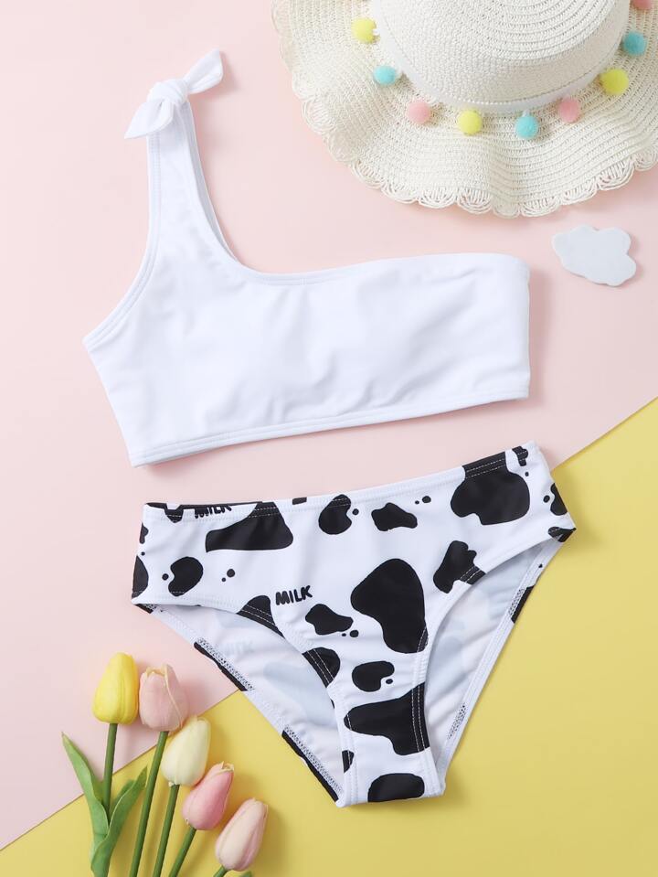 Conjunto de bikini de estampado de vaca con un solo hombro para niña preadolescente, playa de verano