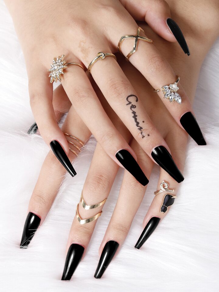 Mejora tu apariencia con 100 uñas postizas largas en forma de ataúd, de color negro liso y brillante. Suministros para uñas