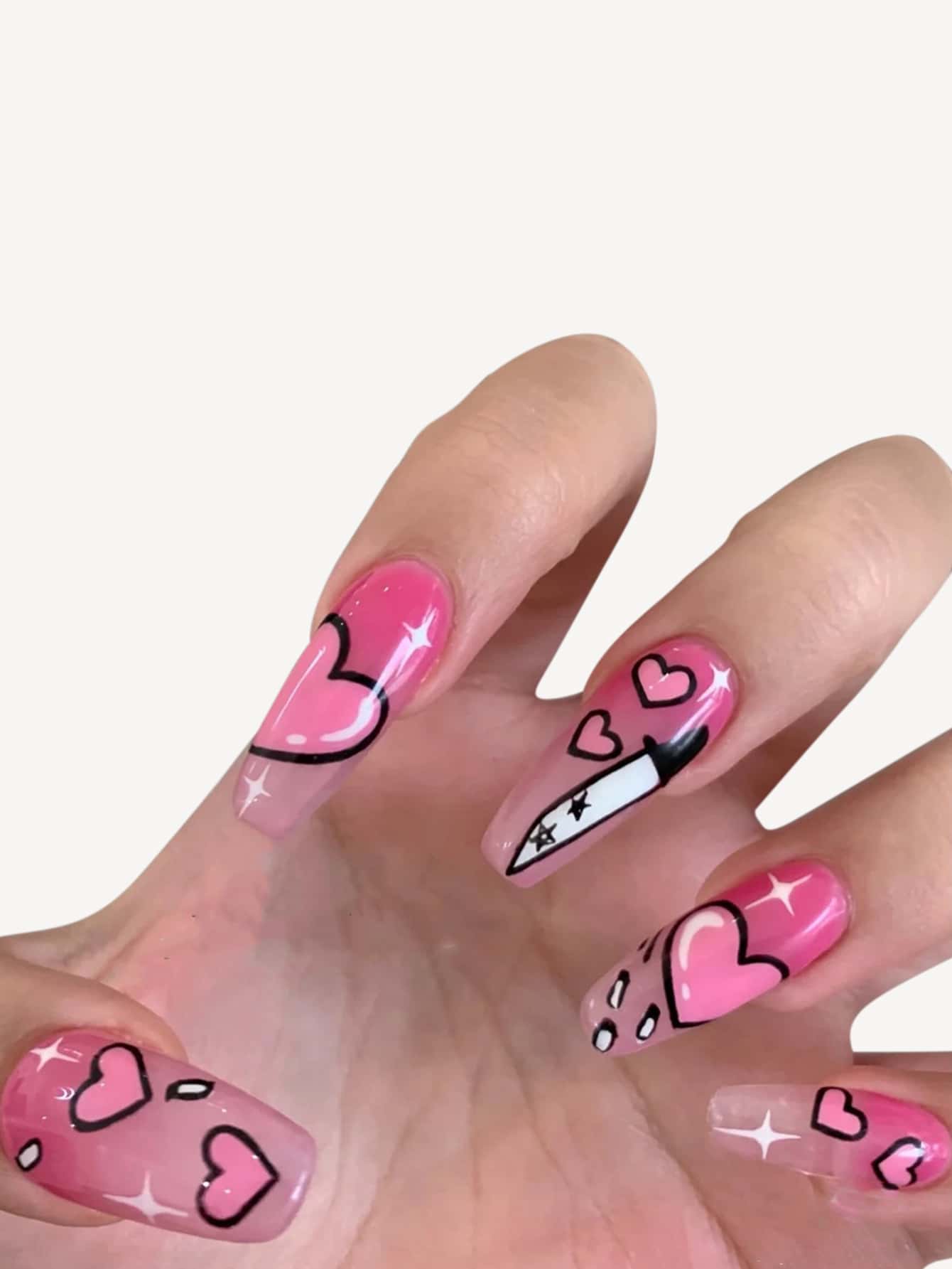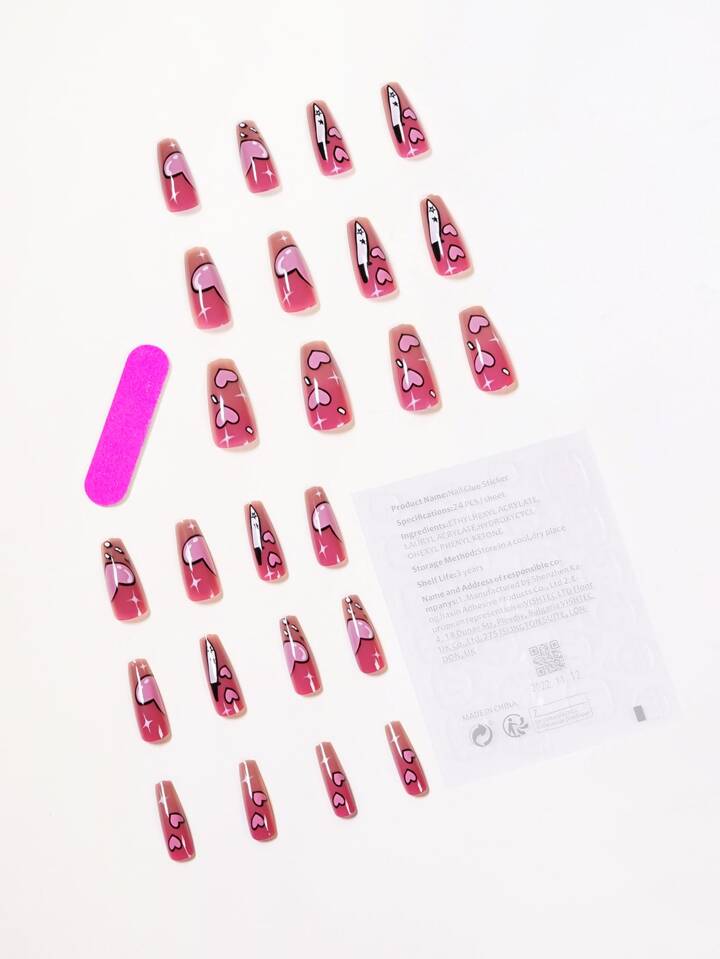 Mejora tu apariencia con 24 uñas postizas con patrón de estrella de corazón rosa de ataúd largo y 1 lima de uñas y 1 hoja de cinta