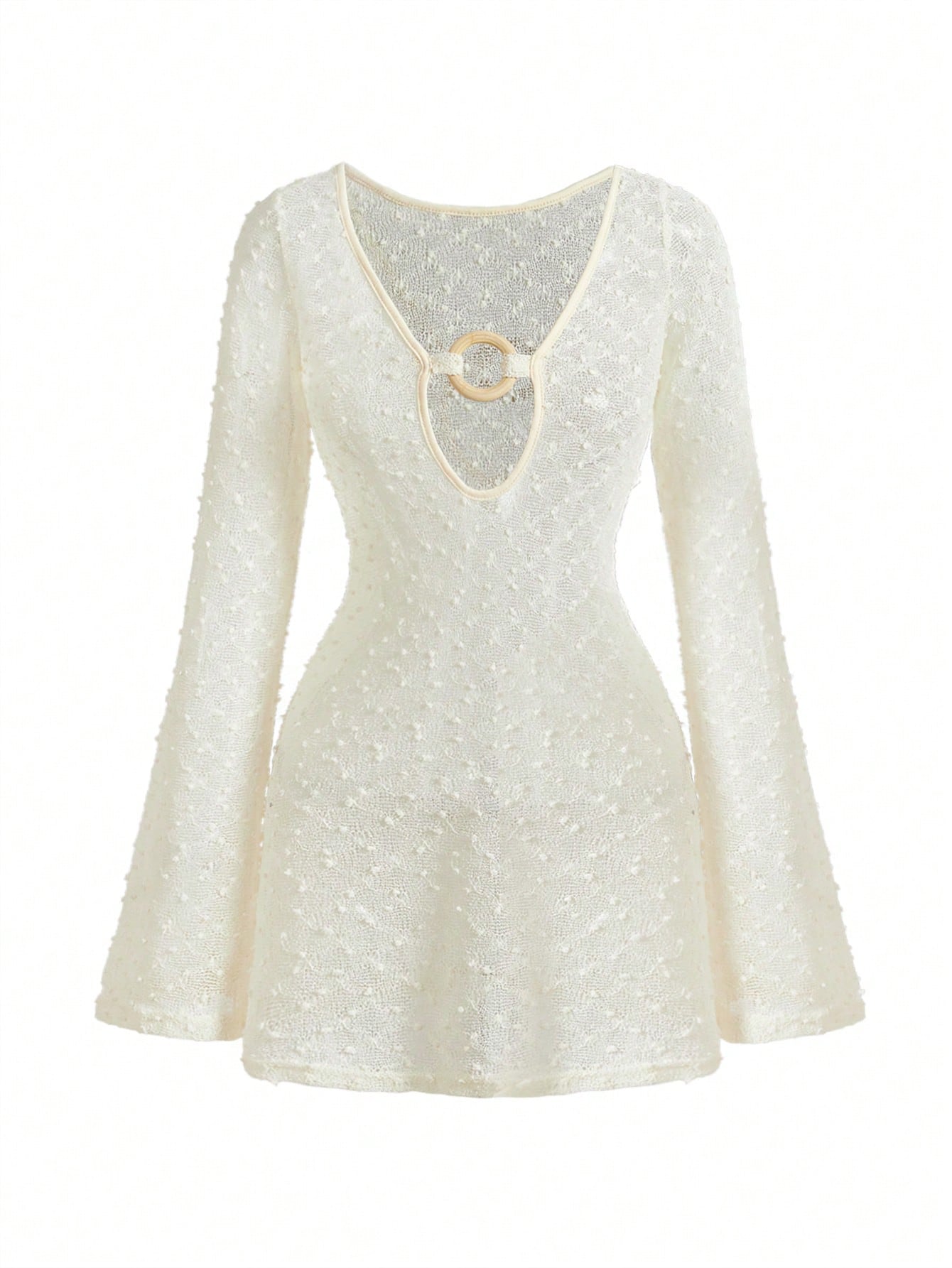 Vestido mini con mangas acampanadas semitransparentes y decoración de metal calado, ideal para vacaciones