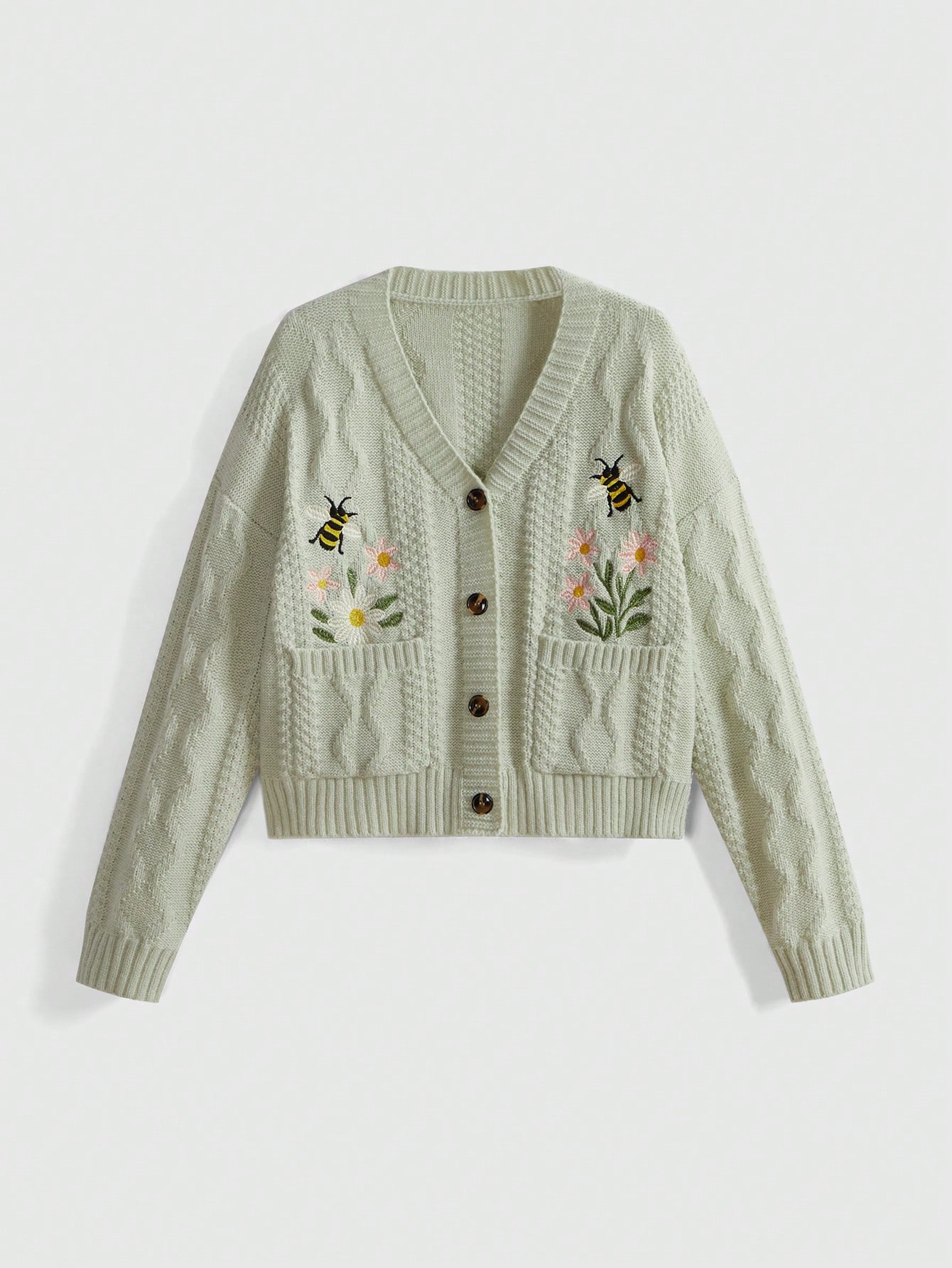 Cárdigan vintage con bordado floral, suéter corto de punto de cable verde claro con cuello en V, chaqueta casual con diseño de bolsillo artístico