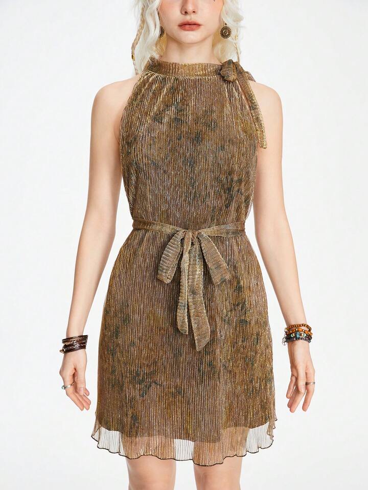 Vestido sin mangas de mujer vintage con pliegues florales y tejido metálico, cuello con soporte y cinturón