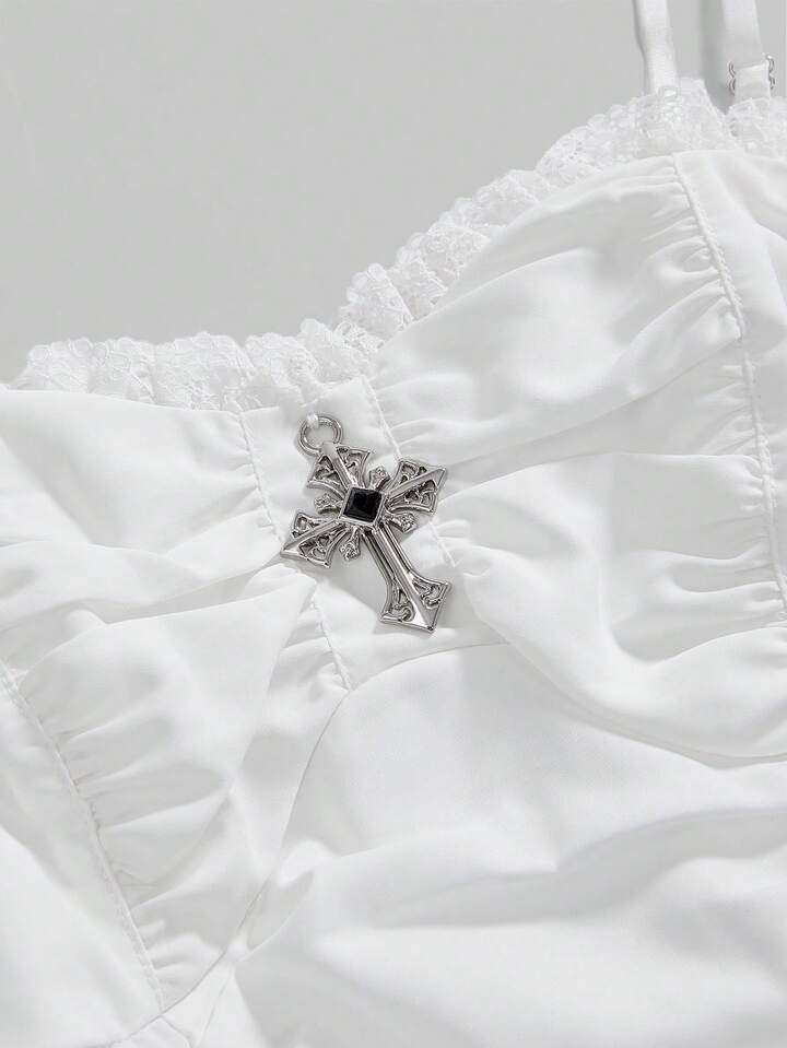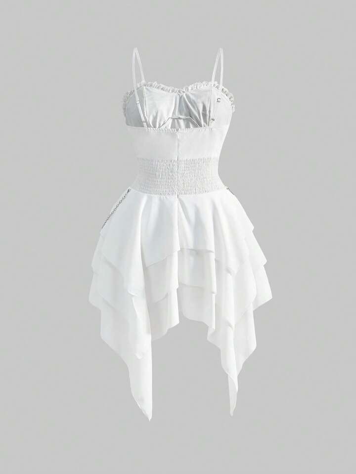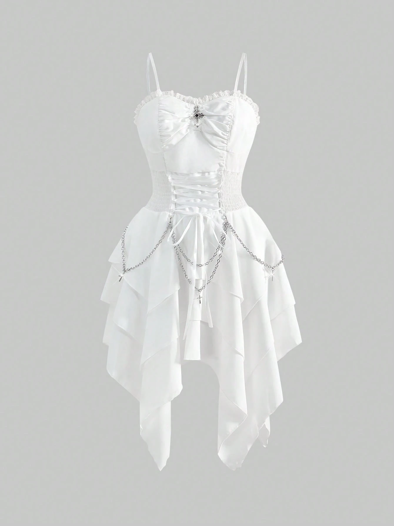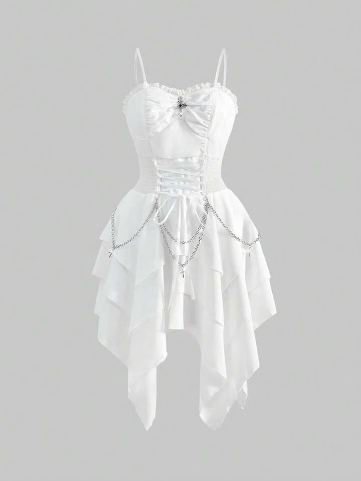 Goth Vestido de mujer con cadena metálica vintage gótica, correa de cintura desmontable y dobladillo asimétrico con volantes