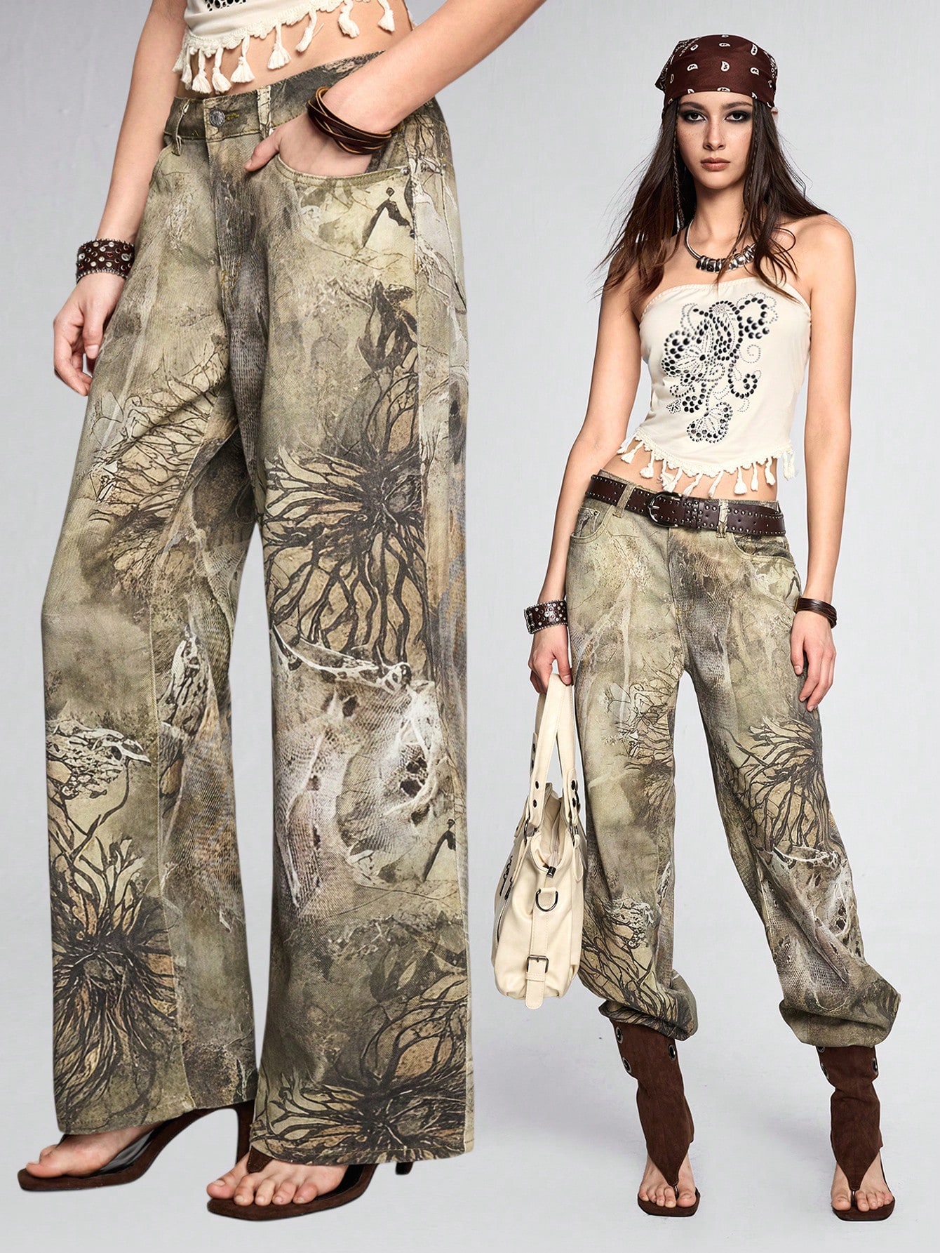 Jeans de pierna recta de cintura baja con patrón retro vintage hippie de vacaciones
