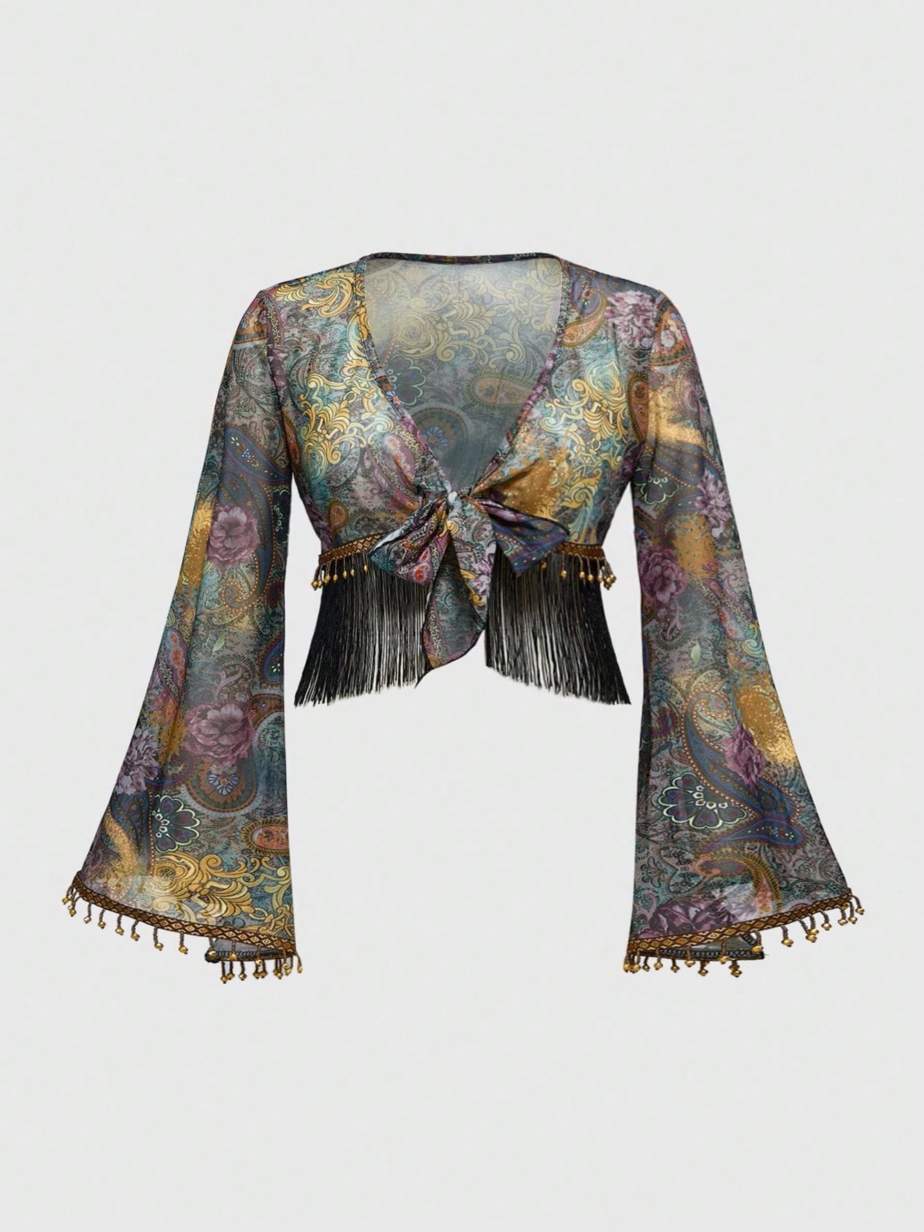 Top talla grande con estampado de paisley, cordones, flecos de cuentas de madera y transparencia, de estilo vintage, hippie, western y de festival de música