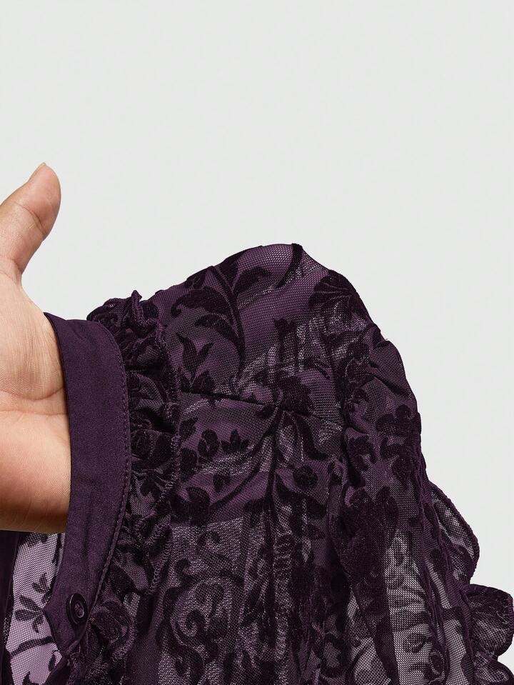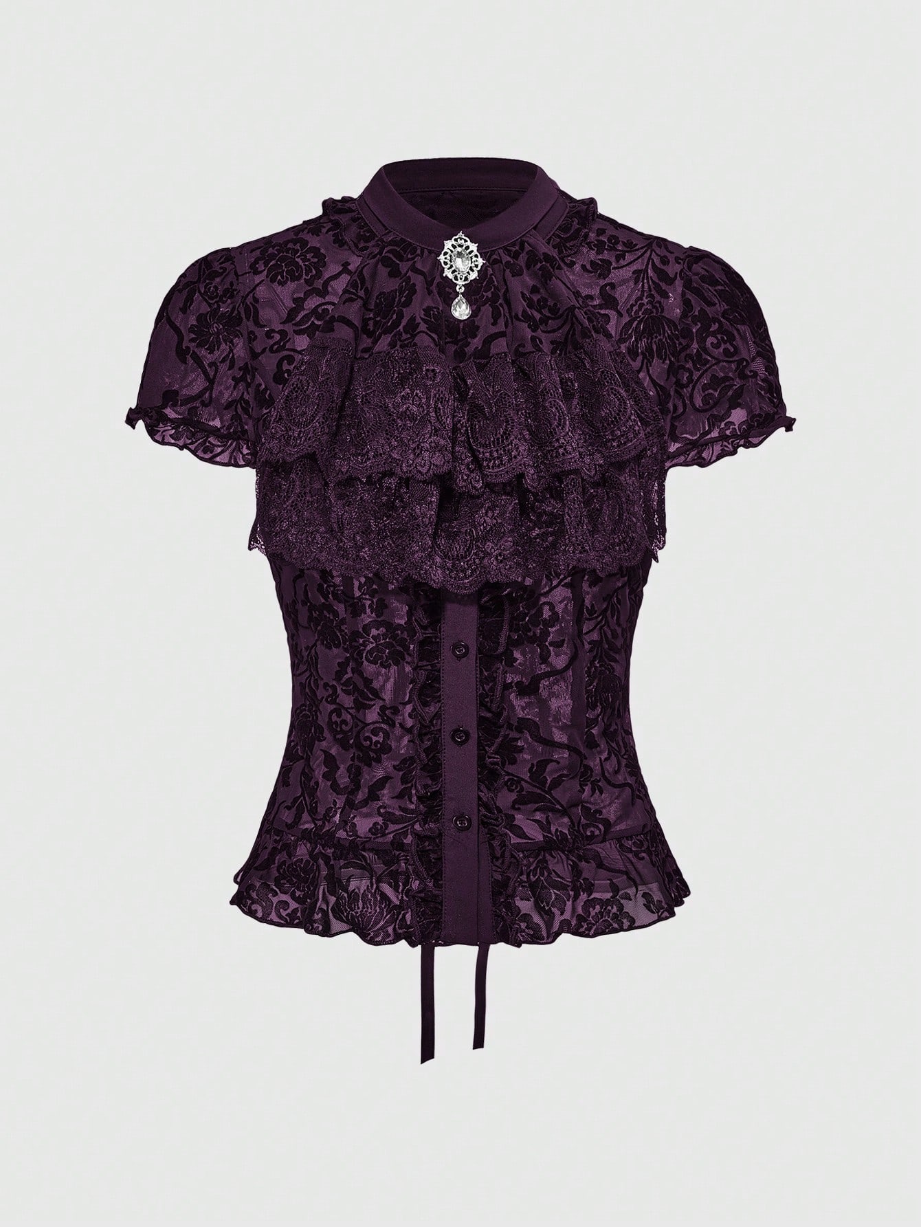Goth Blusa de mujer con cuello de volantes desmontable estilo gótico palaciego con estampado, colgante de cristal barroco, mangas de volantes y lazo en la cintura