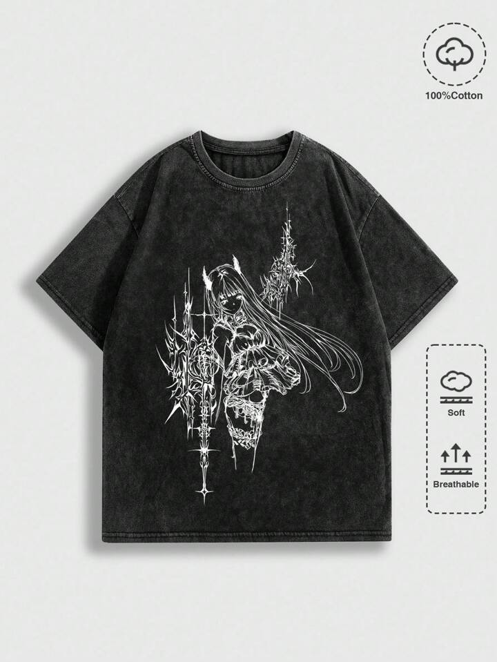 Camiseta casual lavada con estampado de subcultura anime para hombres, adecuada para uso diario en primavera/verano