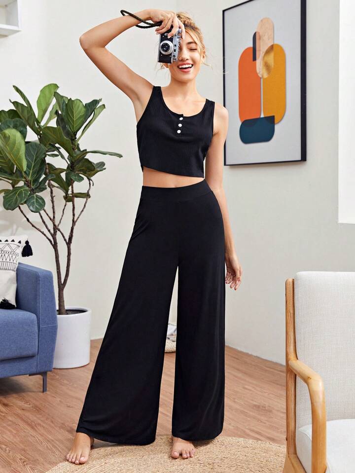 Pantalones holgados de pierna ancha de un solo color tipo palazzo, pantalones casuales de cintura alta y pierna ancha de viscosa negra suelta para mujeres, para uso profesional/de oficina/ropa de trabajo