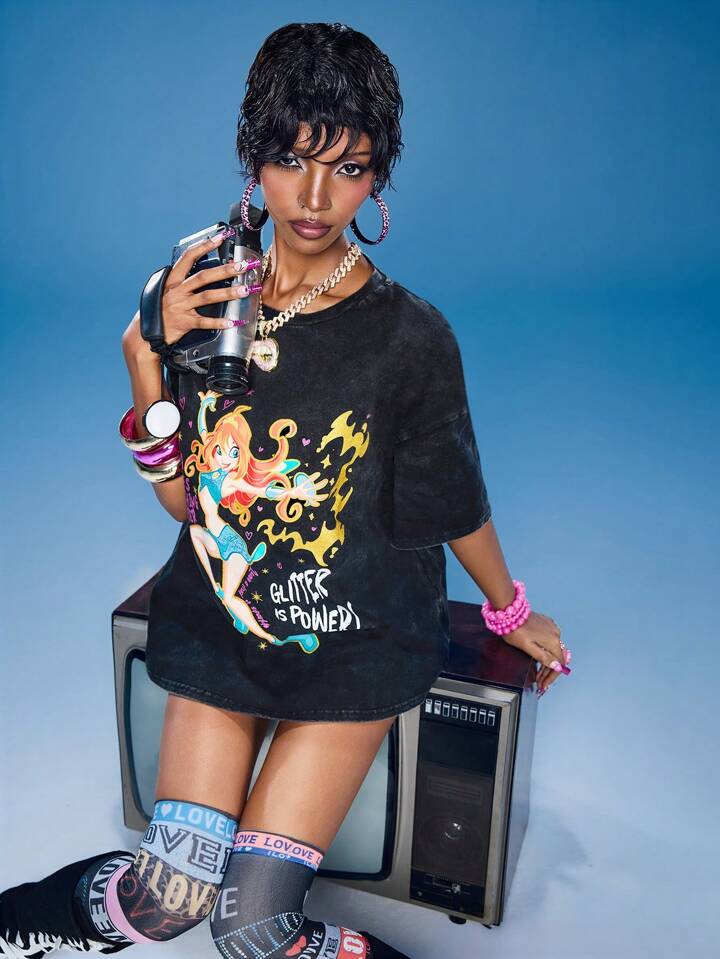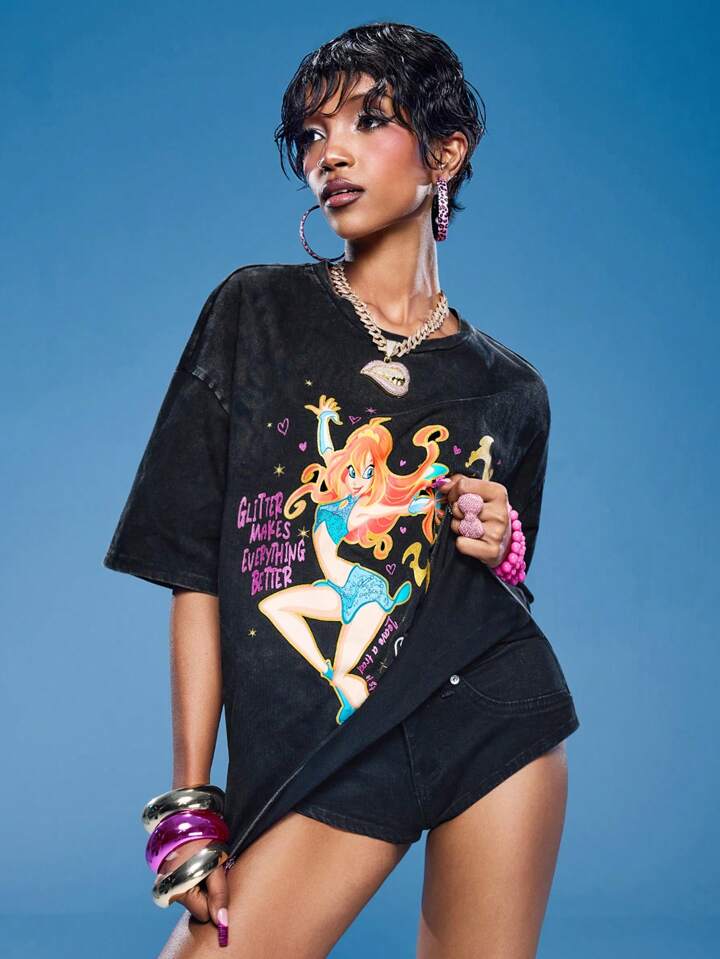 Winx Club X ROMWE Camiseta de manga corta de mujer de corte holgado, de estilo vintage lavado con estampado de dibujos animados, para verano