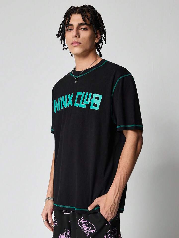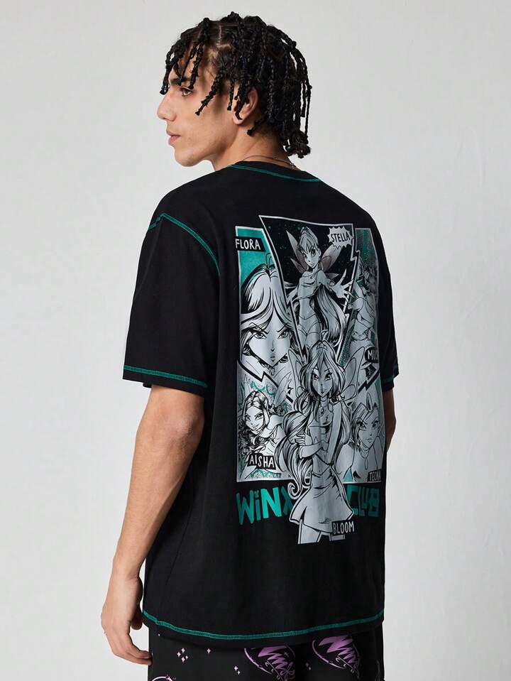 Winx Club X ROMWE Camiseta de cuello redondo de manga corta con gráfico de figura para hombre, de verano