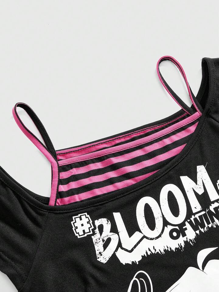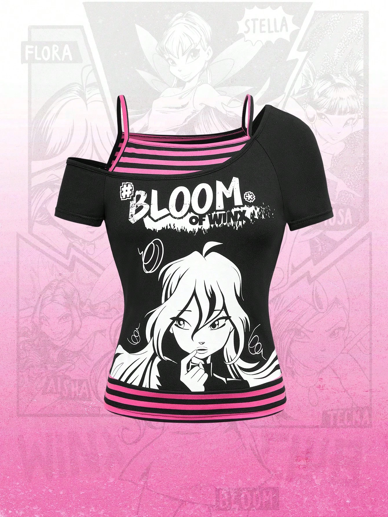 Winx Club X ROMWE Camiseta gráfica con cuello asimétrico de dibujos animados para mujer