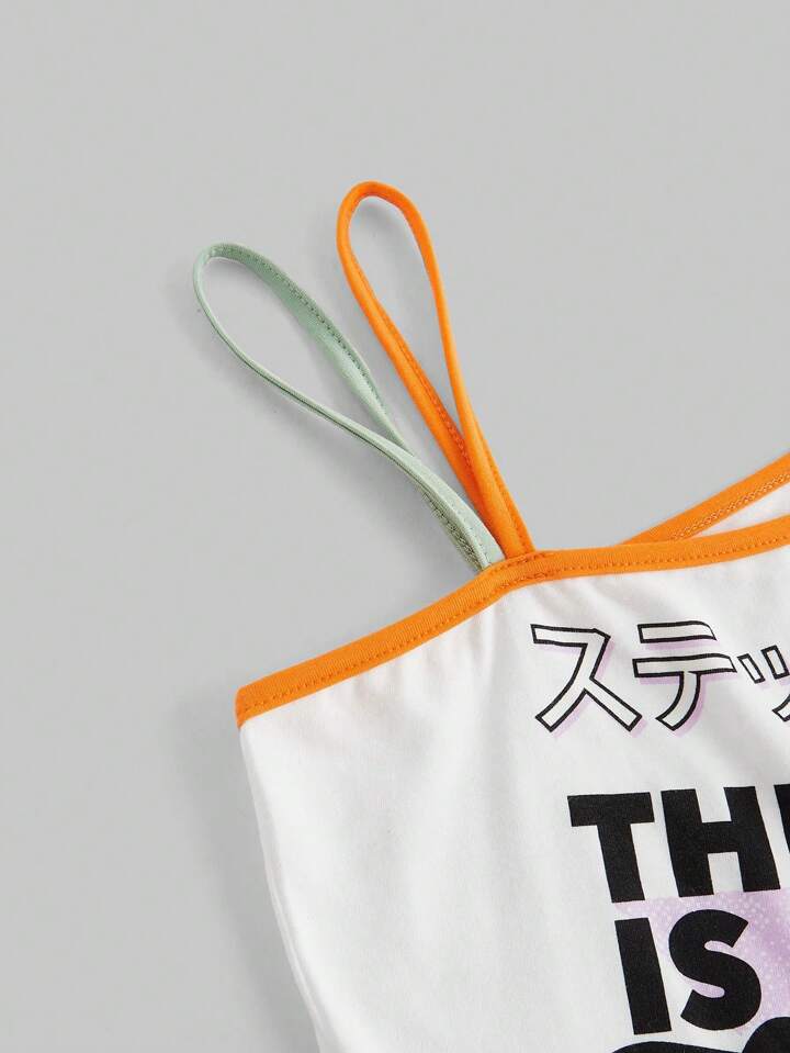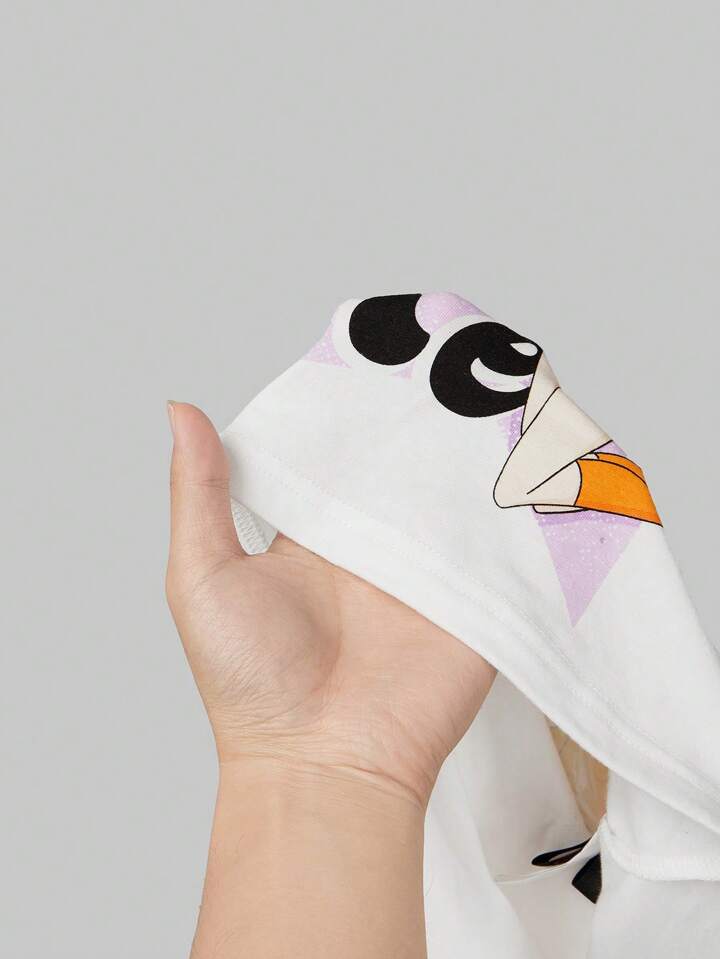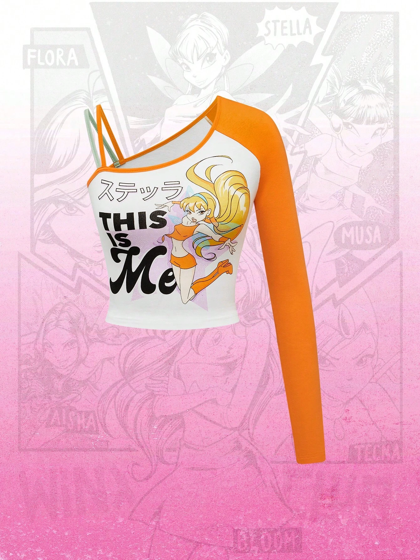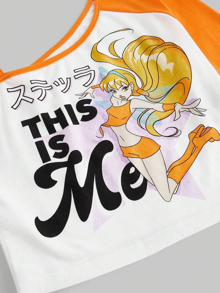 Winx Club X ROMWE Camiseta corta ajustada con estampado de dibujos animados, manga raglán, hombro asimétrico y bloqueo de color para mujer