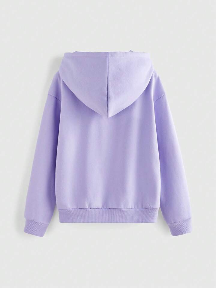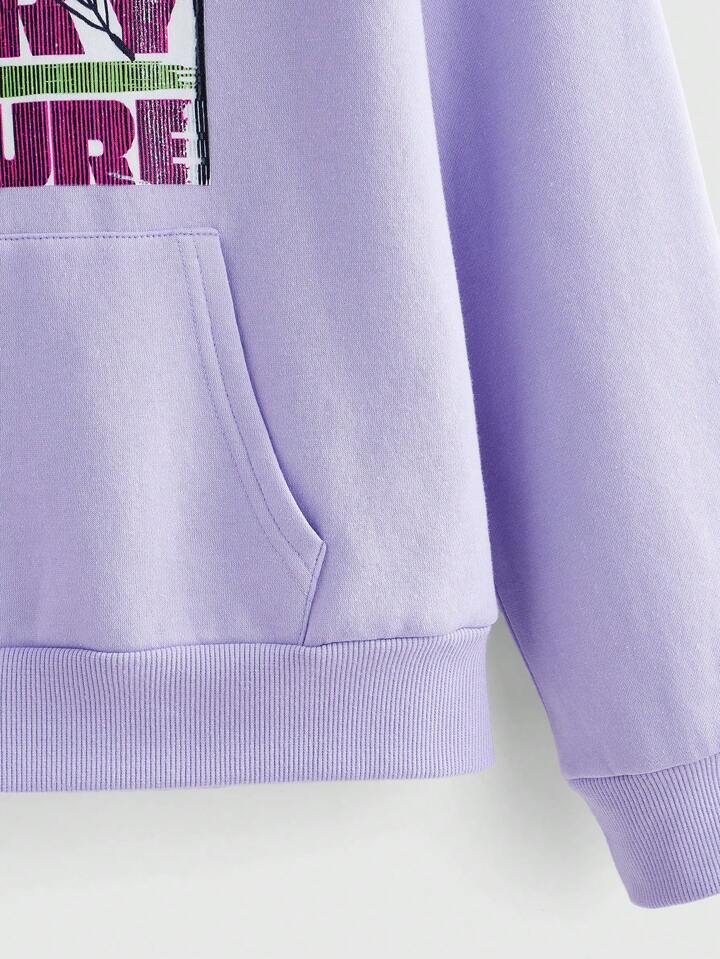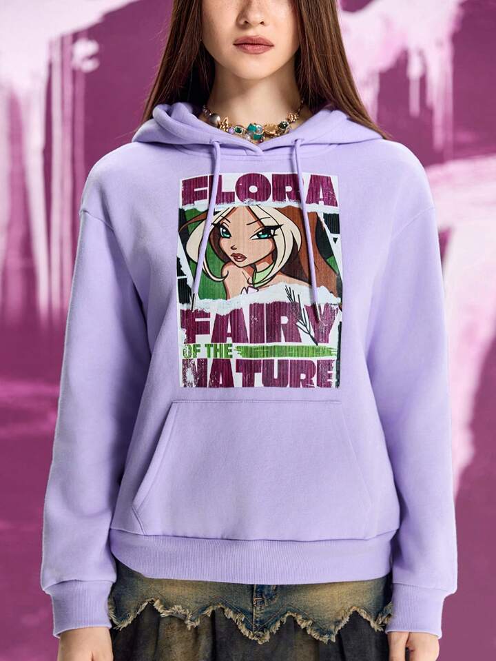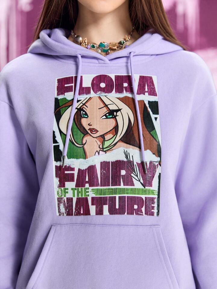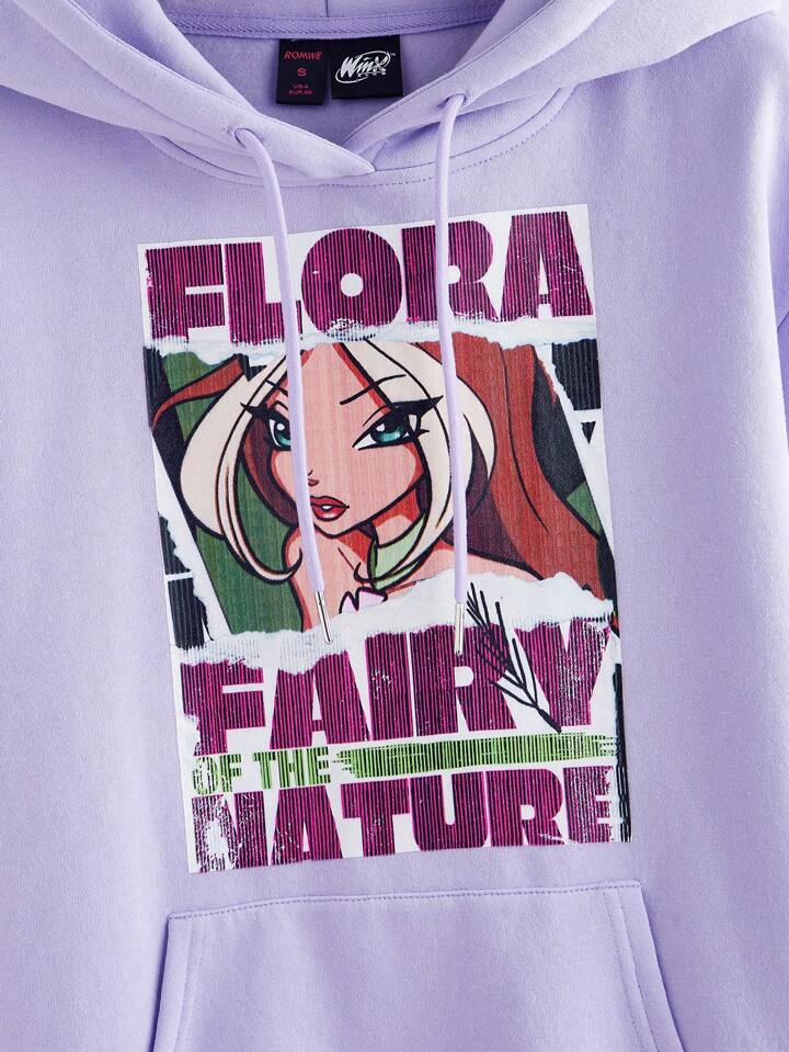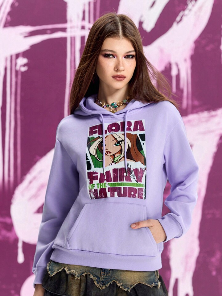 Winx Club X ROMWE Sudadera holgada con capucha, bolsillos y cordón de ajuste, con estampado de personajes de dibujos animados y eslóganes, para mujer, de estilo casual