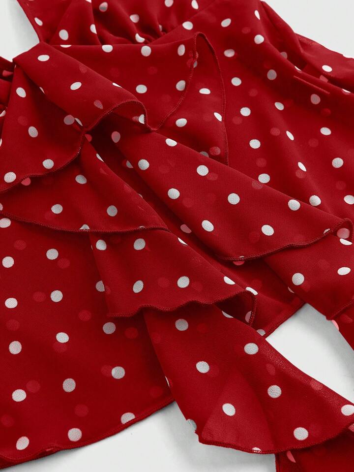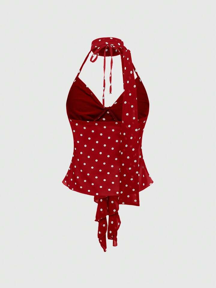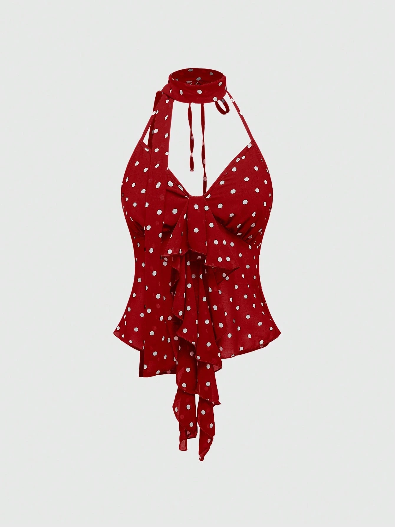 Camiseta de tirantes con cuello alto, diseño con volantes y estampado completo de lunares de estilo Y2K sexy para mujer