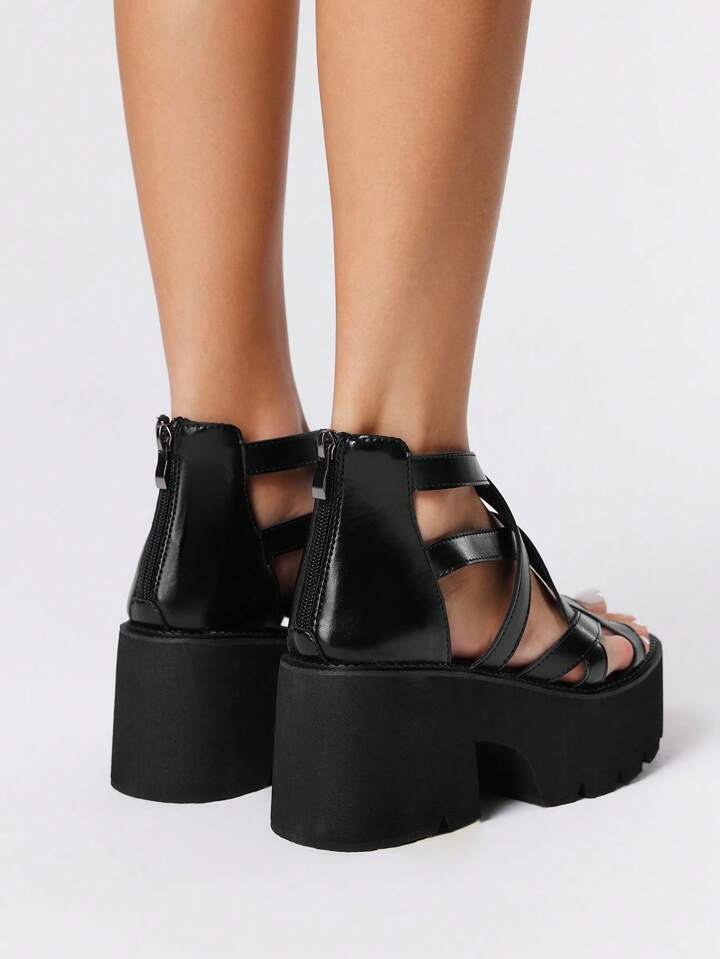 Goth Sandalias de plataforma casuales de estilo romano retro negras para mujer, sandalias de plataforma con tacón alto, con correa cruzada y cierre trasero de cremallera, de estilo gótico punk